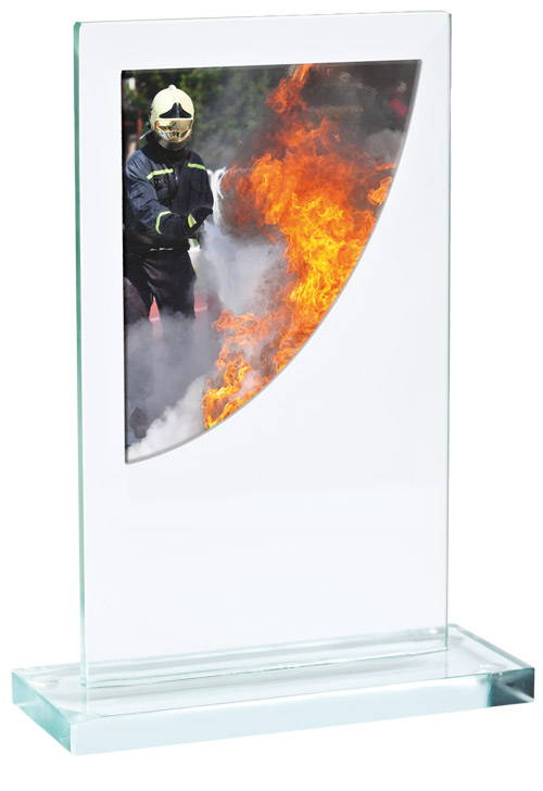 Skleněná trofej s akrylátovým motivem. Na trofej lze umístit logo či text. Laserové gravírování.