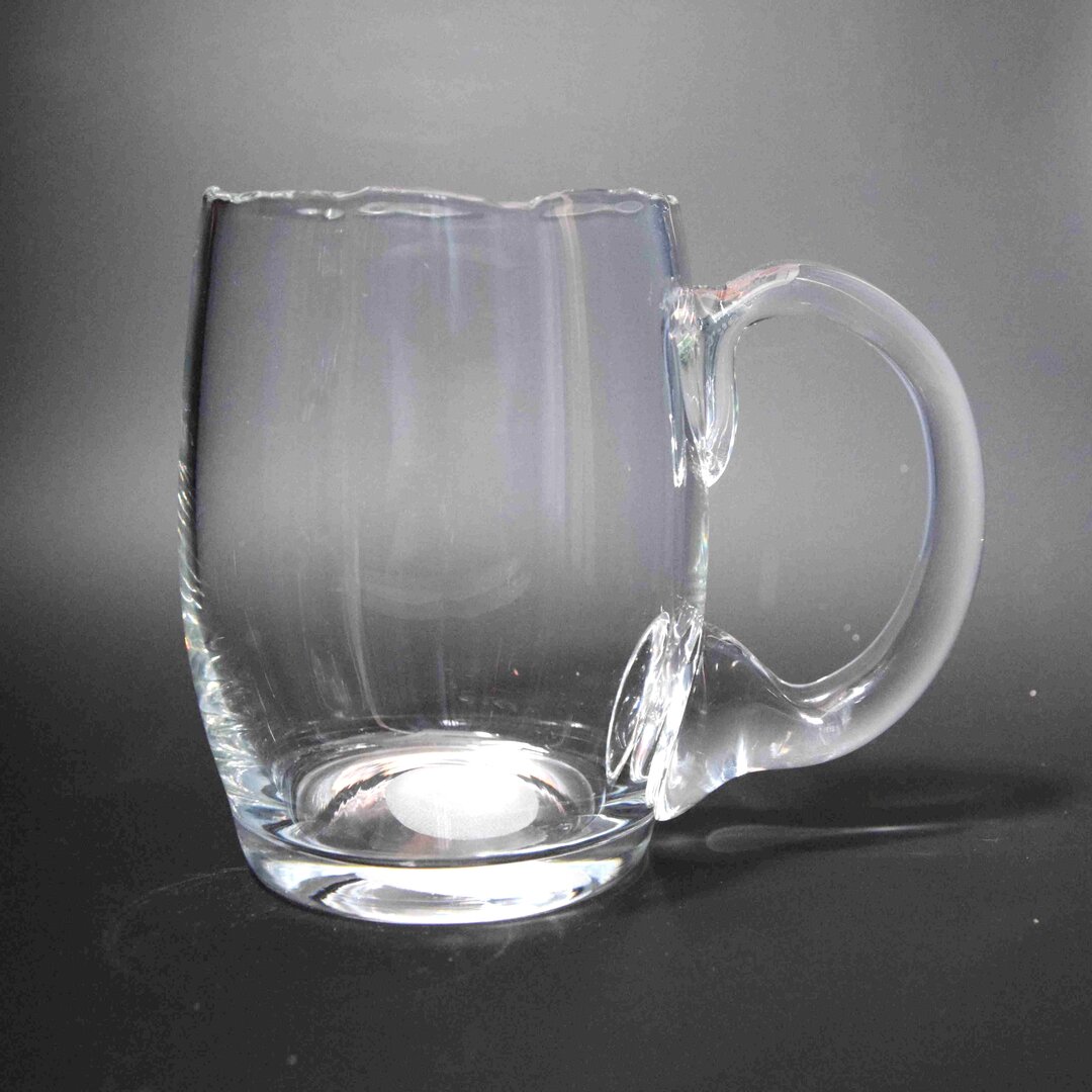 Dárkový půllitr s uchem ze silnostěnného foukaného skla s nepravidelným horním okrajem a prostorem pro umístění dekoru.