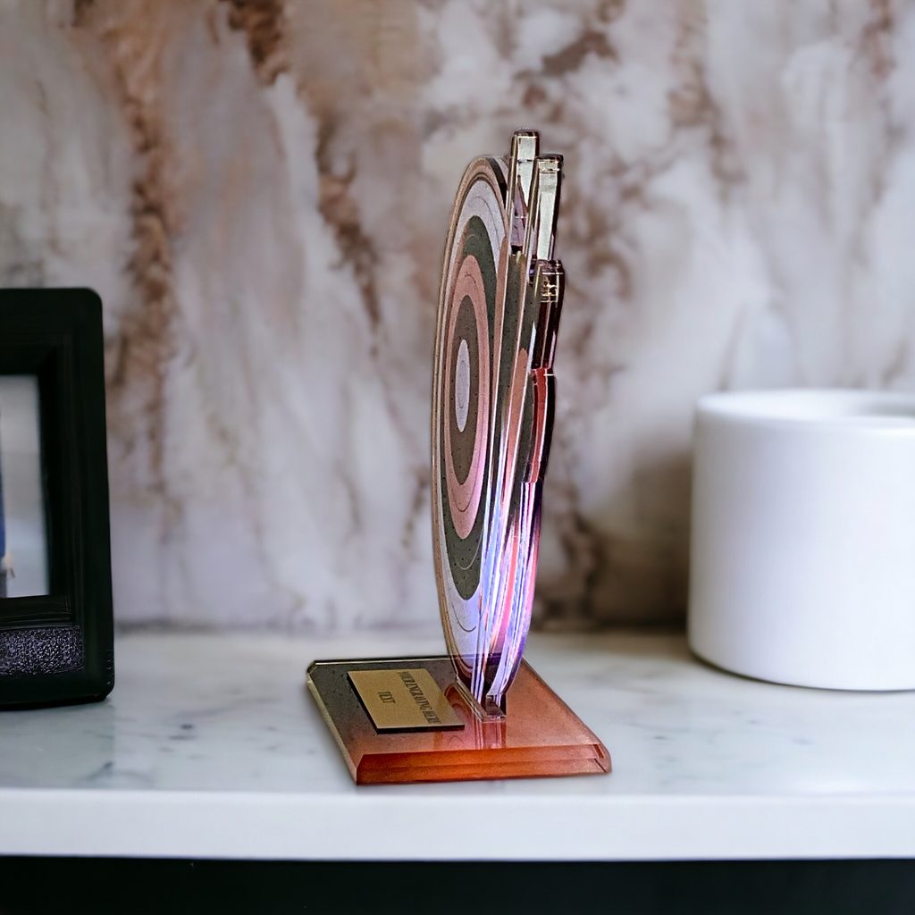 Akrylátová trofej. V ceně trofeje není zahrnuta cena štítku. Akrylátový motiv 0.6 cm. Oboustranný tisk.