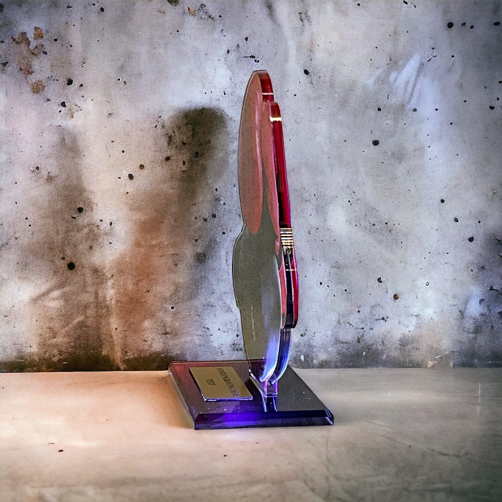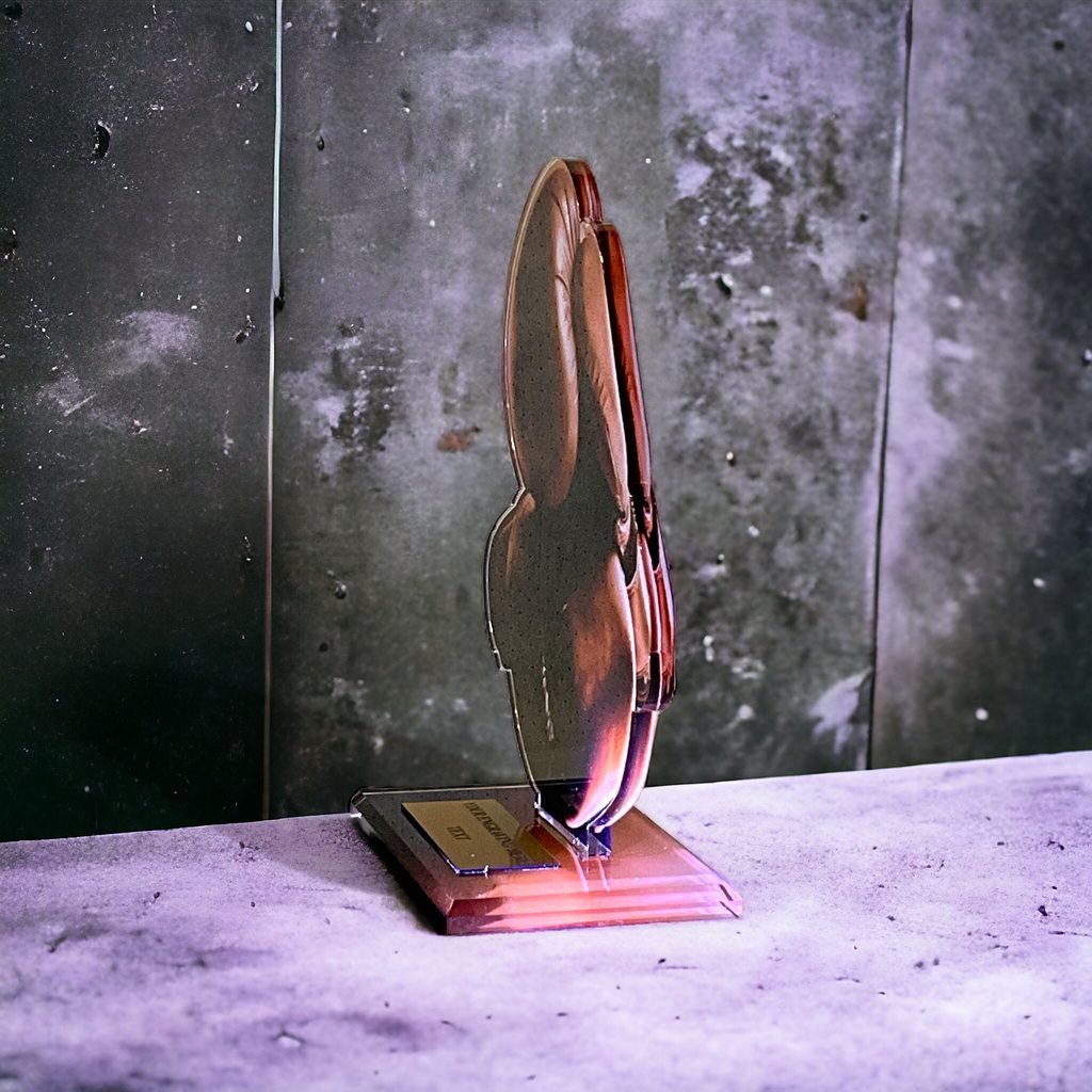 Akrylátová trofej. V ceně trofeje není zahrnuta cena štítku. Akrylátový motiv 0.6 cm. Oboustranný tisk.
