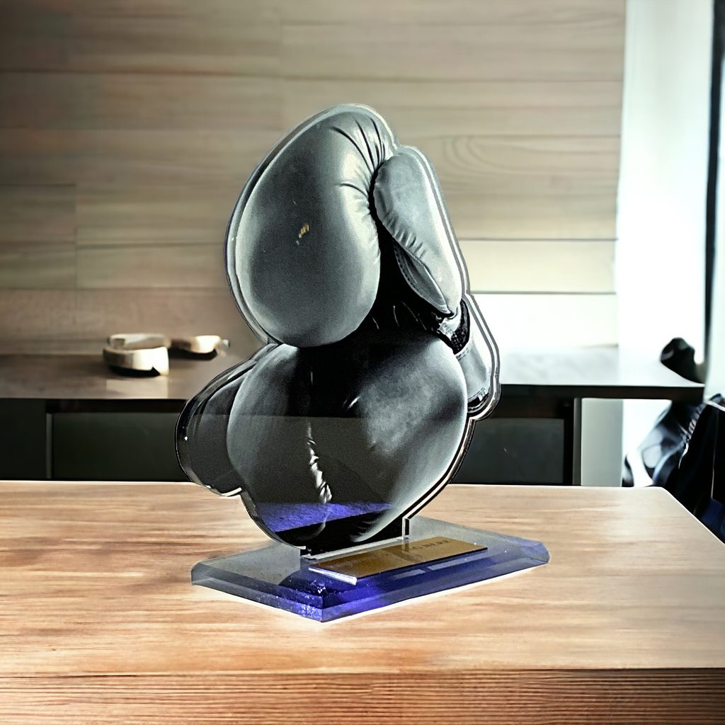 Akrylátová trofej z akrylátového skla s UV potiskem na podstavci. Tloušťka 1 cm. Možnost vložení textu do trofeje.
