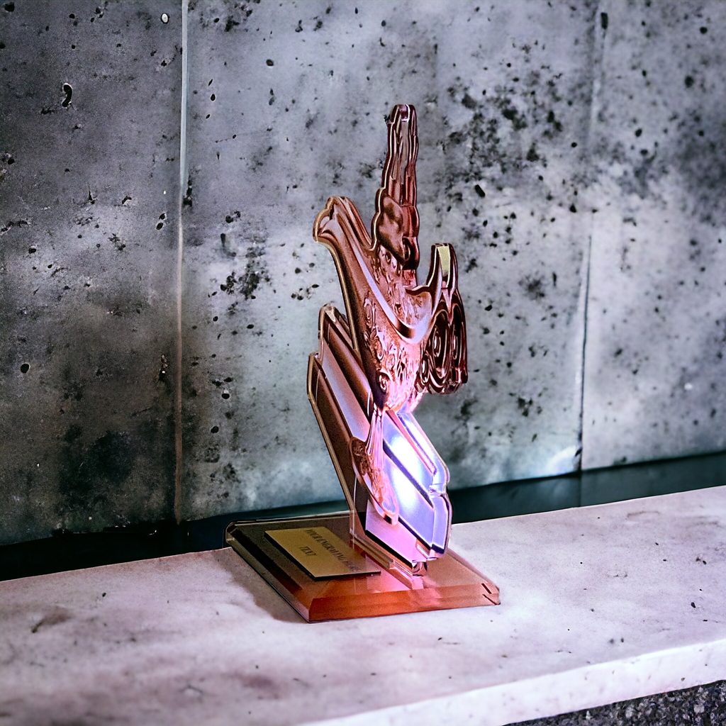 Akrylátová trofej. V ceně trofeje není zahrnuta cena štítku. Akrylátový motiv 0.6 cm. Oboustranný tisk.