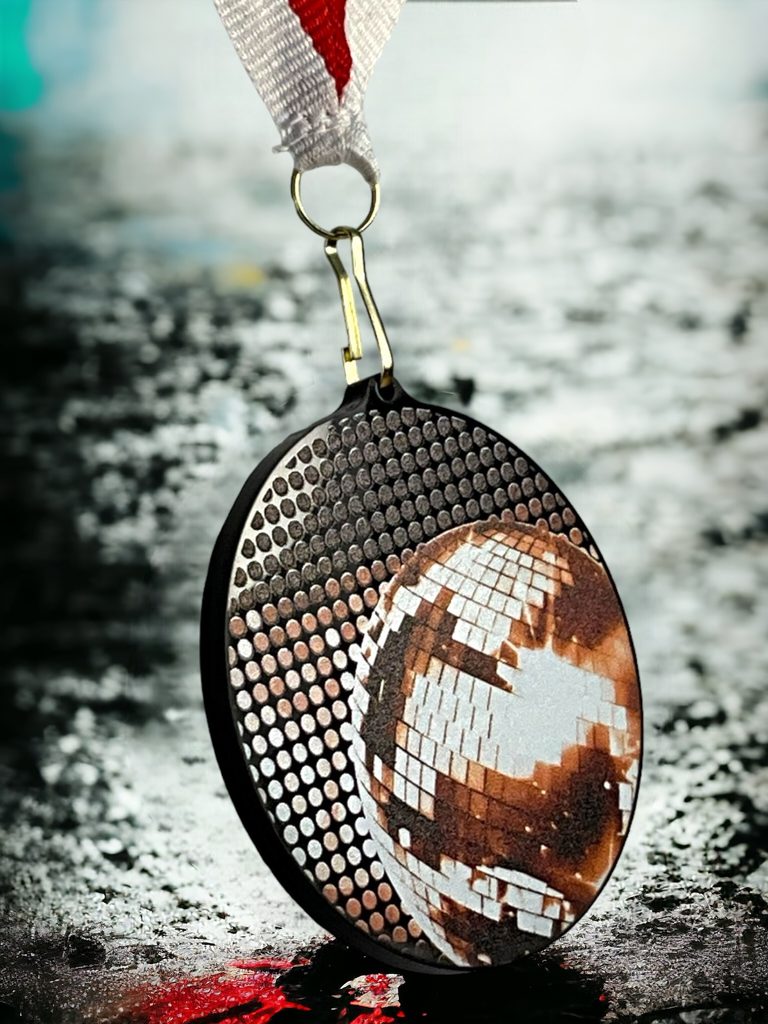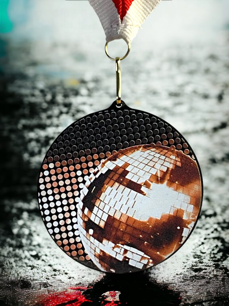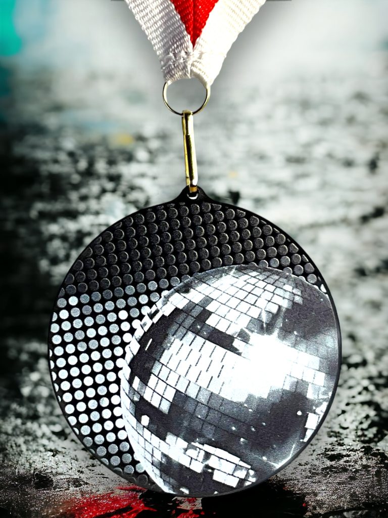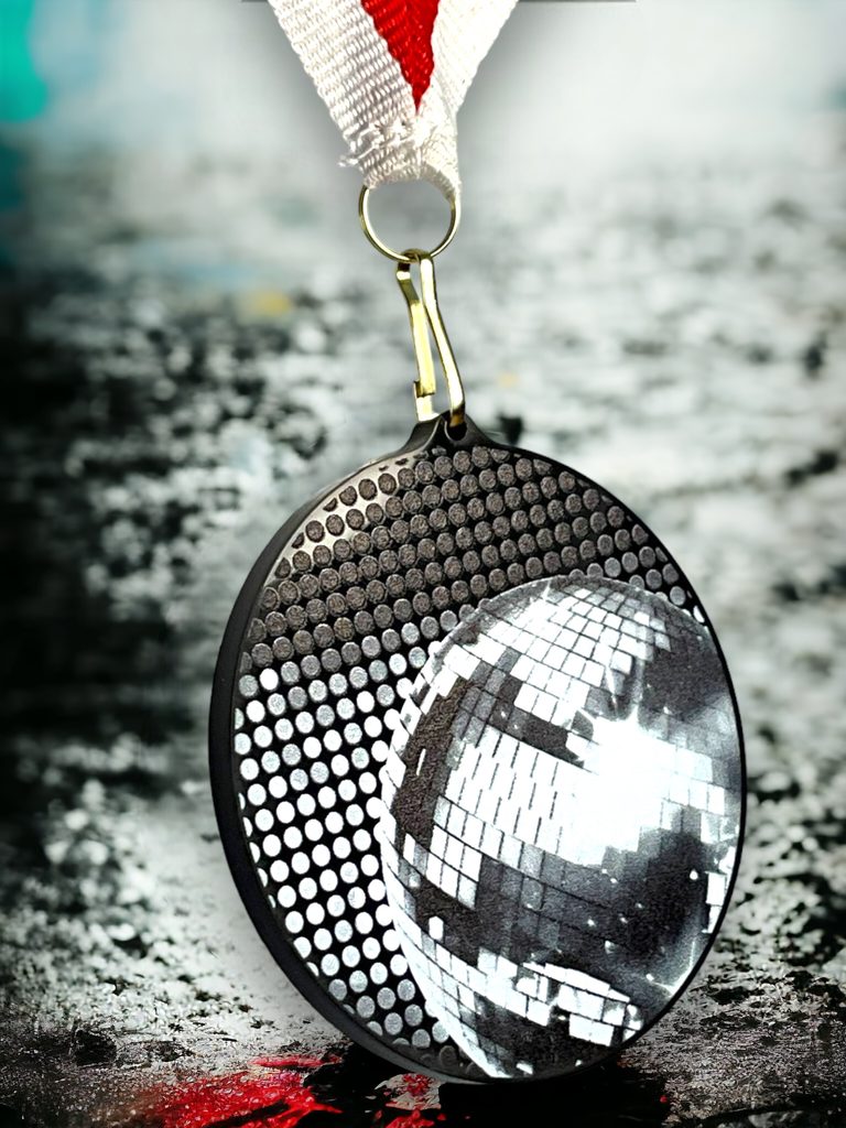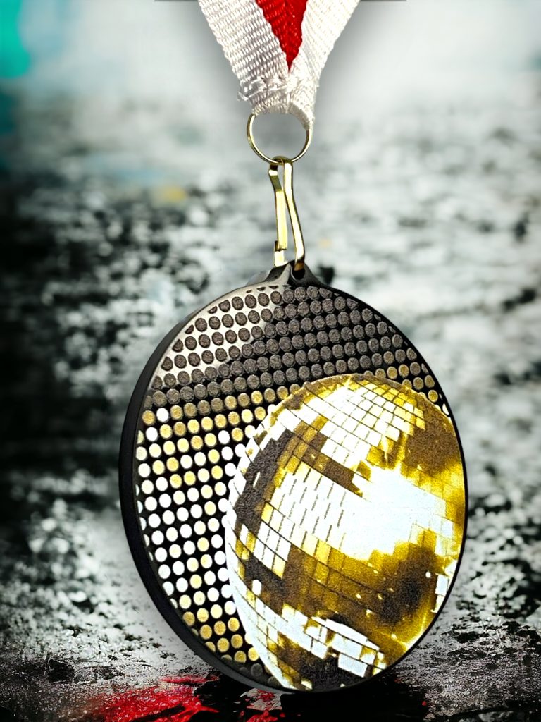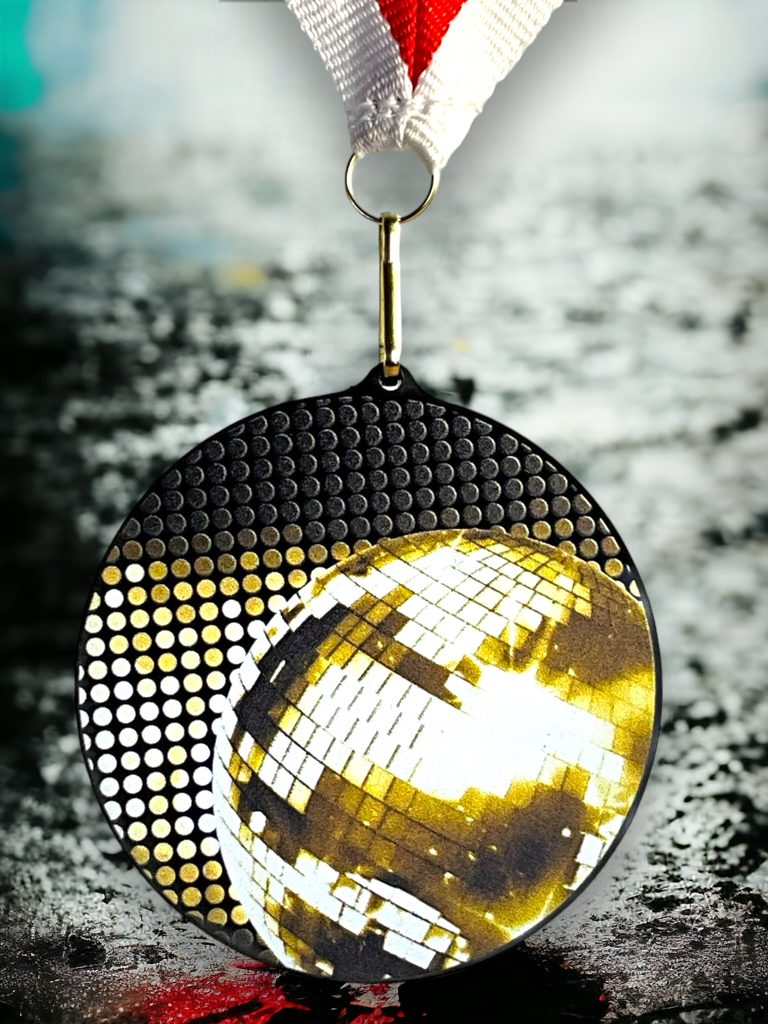 Akrylátová medaile. Tloušťka 0,3 cm. Cena medaile za 1 kus včetně stuhy. Speciální černý lesklý akryl. Speciální vrstvený tisk.