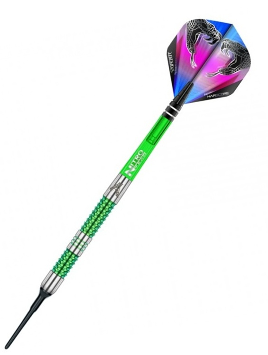 Softové šipky Red Dragon Peter Wright Snakebite Mamba jsou wolframové šipky (90% tungsten) v originálním designu. Zelená barva dodává šipkám jedinečný vzhled a díky vroubkování barrelu skvěle padnou do ruky. Barrely jsou doplněny nylonovými násadkami Nitrotech a letkami Red Dragon.
