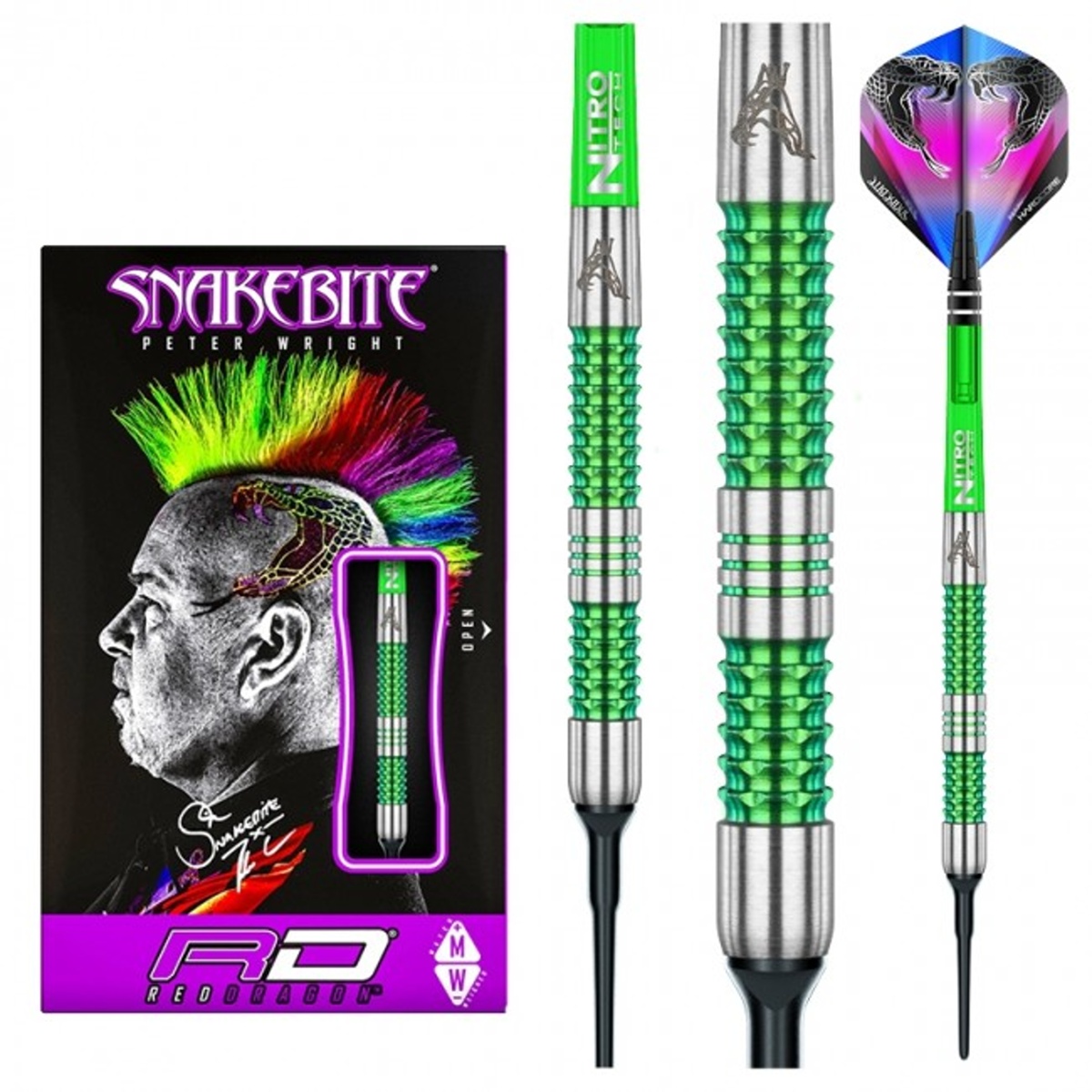 Softové šipky Red Dragon Peter Wright Snakebite Mamba jsou wolframové šipky (90% tungsten) v originálním designu. Zelená barva dodává šipkám jedinečný vzhled a díky vroubkování barrelu skvěle padnou do ruky.