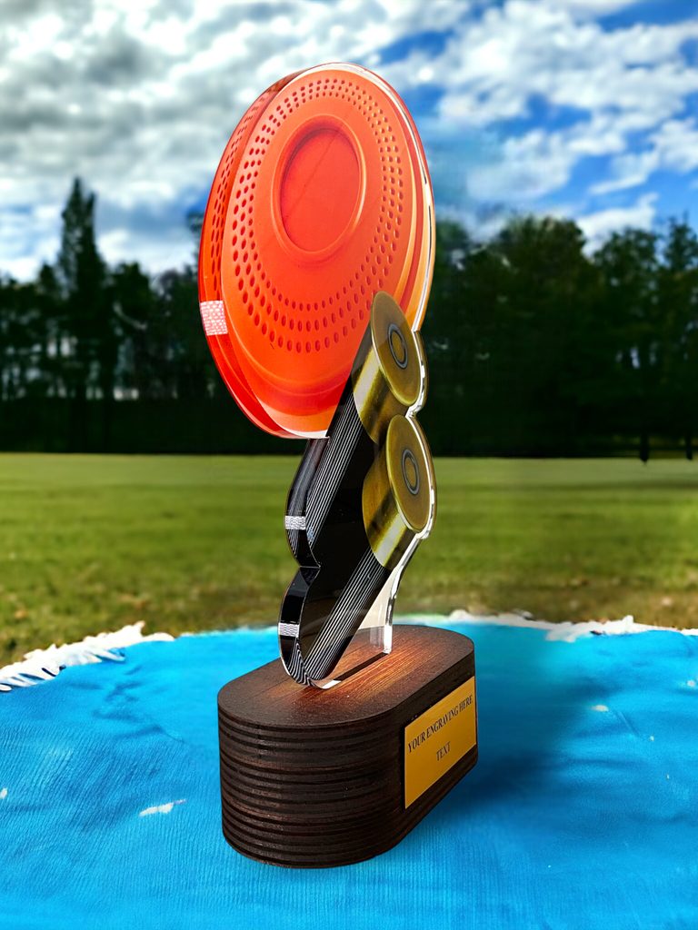 Akrylátová trofej s dřevěným podstavcem a UV potiskem. V ceně trofeje není zahrnuta cena štítku.