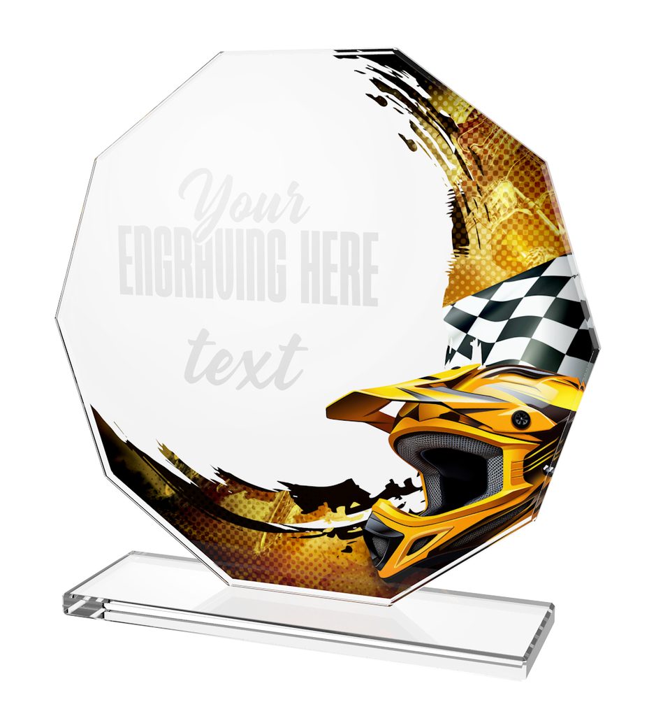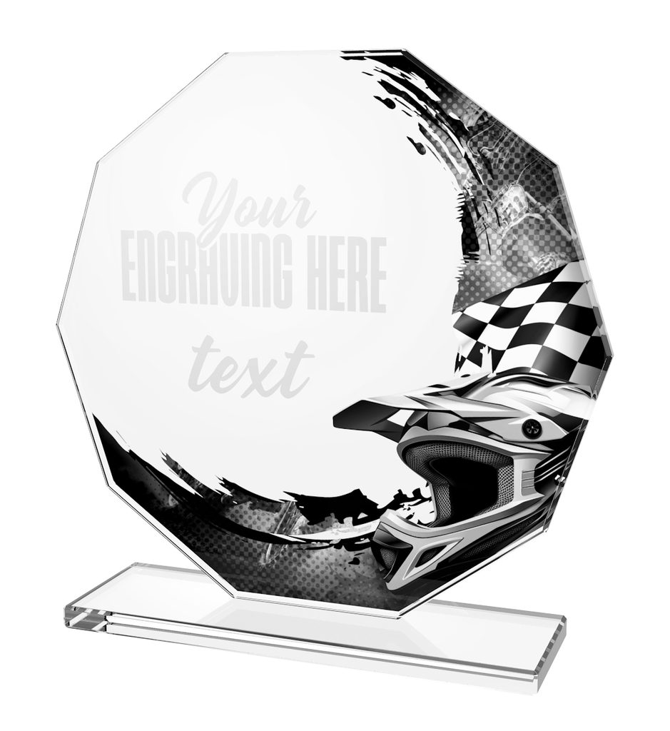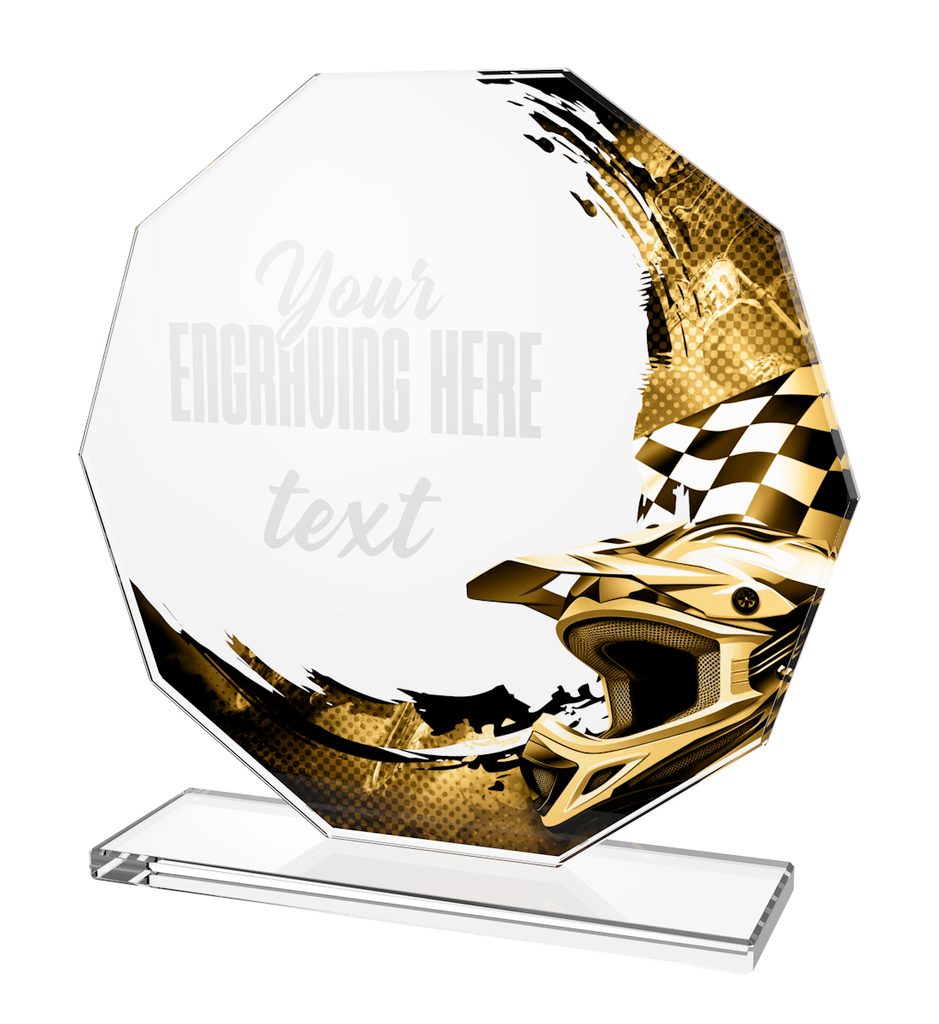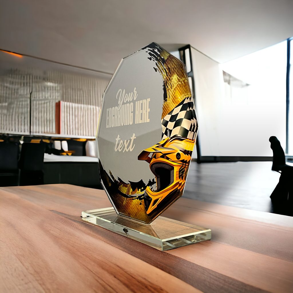 Skleněná trofej s UV HQ tiskem. Kombinace skla a dřeva. Motiv v ceně. Možnost UV HQ tisku bílou barvou na podstavec.
