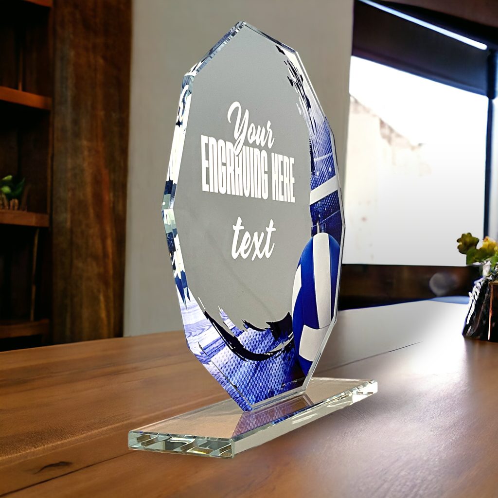 Skleněná trofej s UV HQ tiskem. Kombinace skla a dřeva. Motiv v ceně. Možnost UV HQ tisku bílou barvou na podstavec.