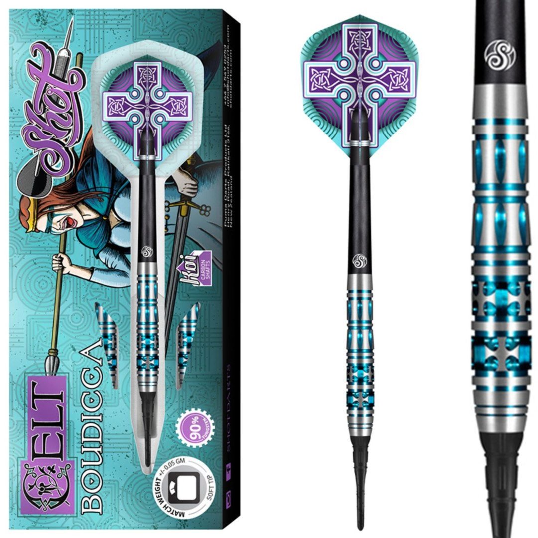 Softové šipky Shot Celt Boudicca jsou wolframové šipky (90% tungsten) v naprosto ohromujícím designu. Jedinečné drážkování barrelu je zvýrazněno modrou barvou. Barrely jsou doplněny nylonovými násadkami a letkami Shot.