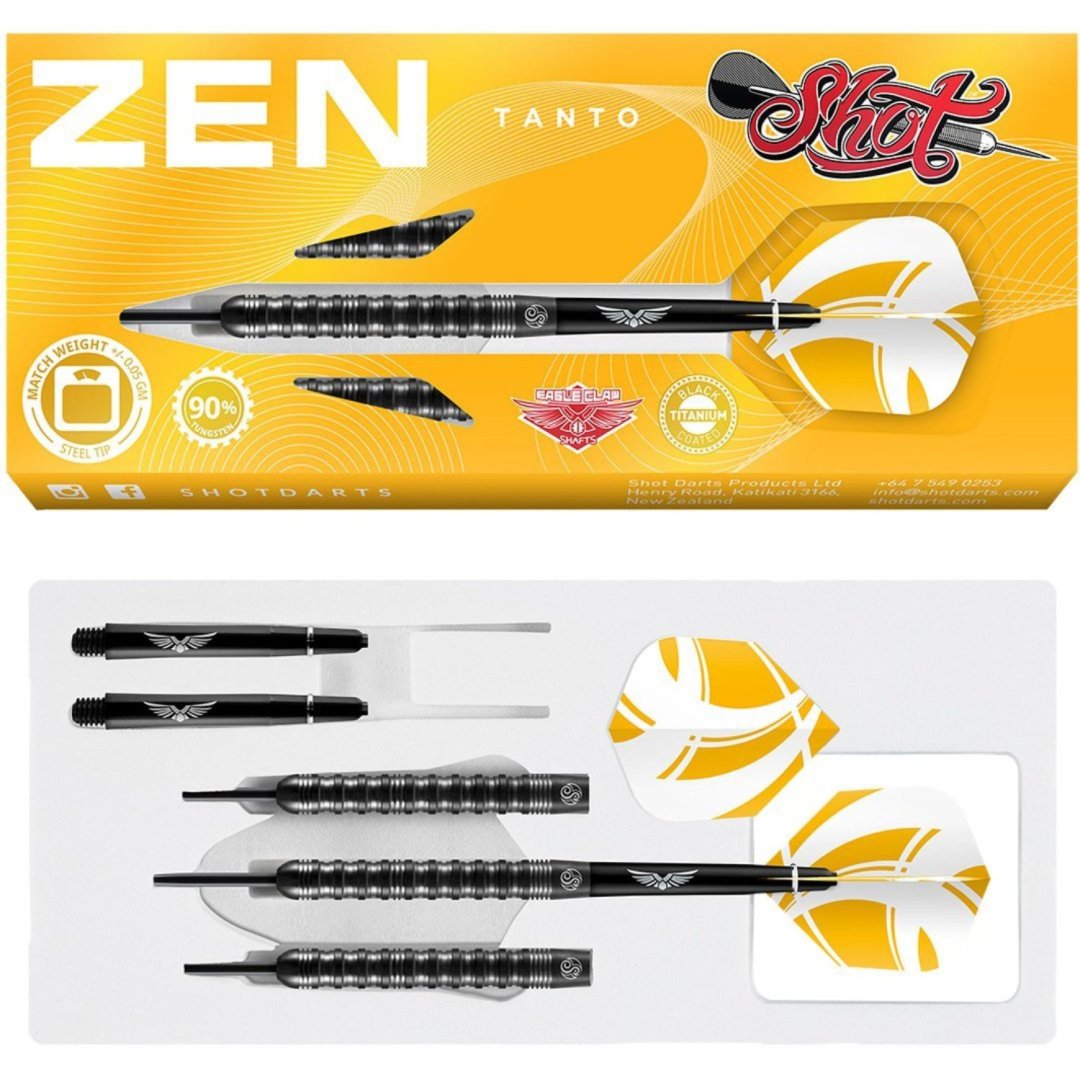 Steelové šipky Shot Zen Tanto jsou wolframové šipky (90% tungsten) s černými drážkovanými barrely. Barrely jsou doplněny nylonovými násadkami a letkami Shot.