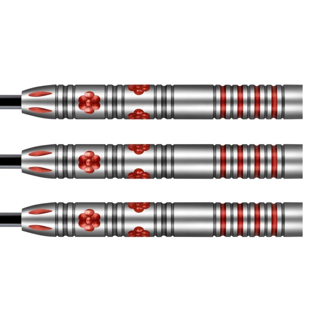 Steelové šipky Shot Pro Series - Barbora Hospodárská jsou wolframové šipky (90% tungsten) s barrely, jež zdobí červené kytičky a červené drážky.