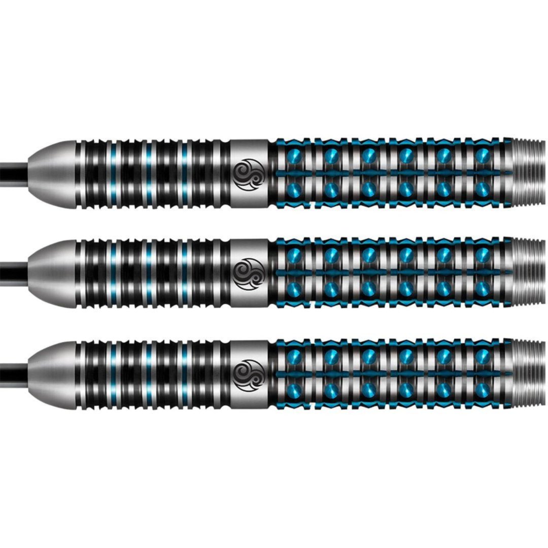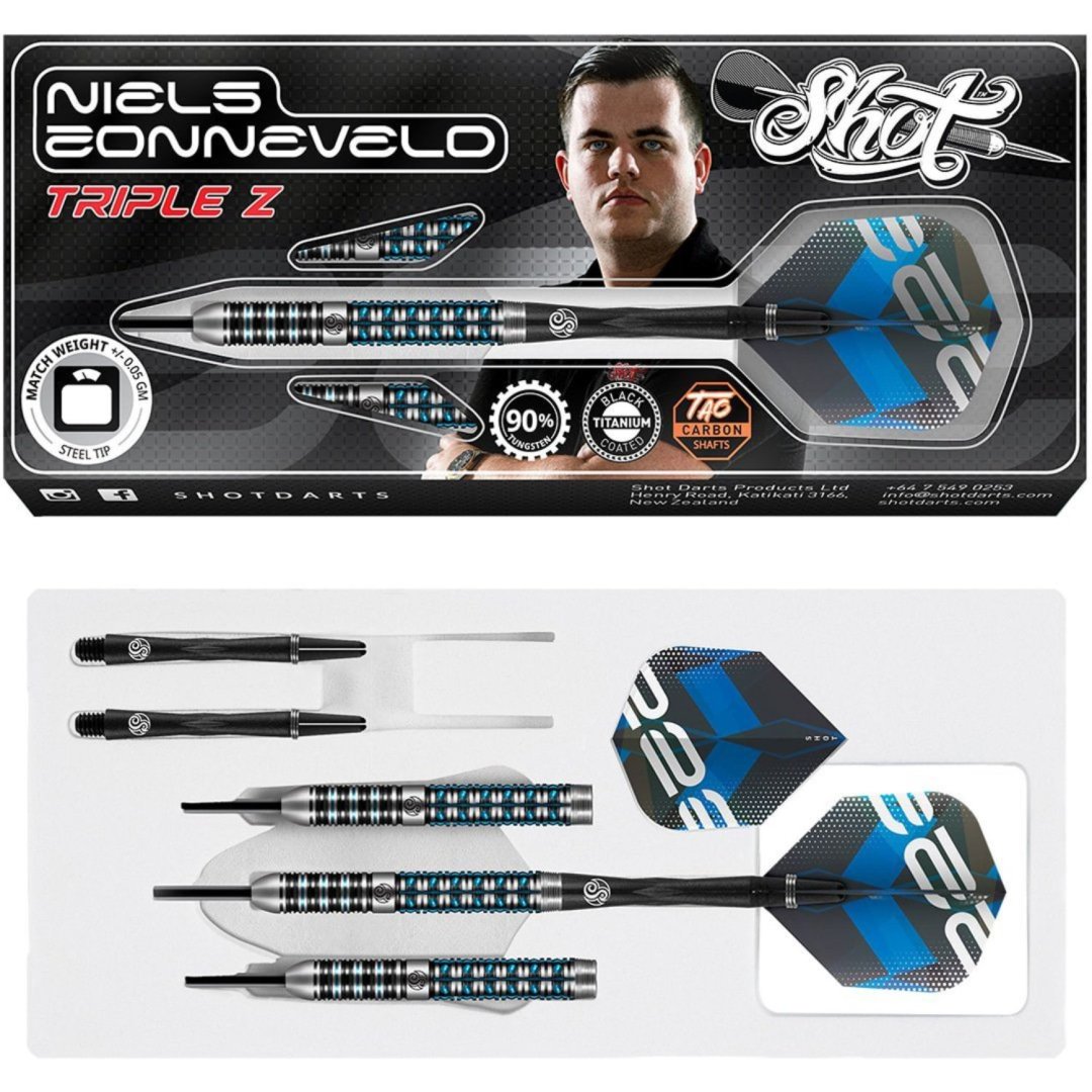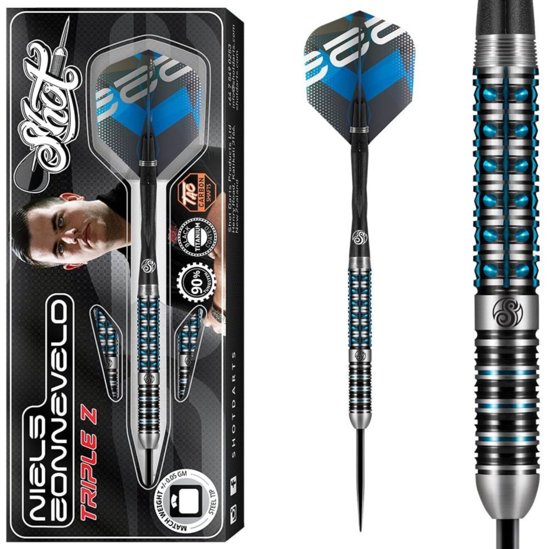 Steelové šipky Shot Niels Zonneveld jsou wolframové šipky (90% tungsten) v ohromujícím designu. Drážkování barrelu ještě zvýrazňuje černá a modrá barva, což šipce dodává jedinečný vzhled. Barrely jsou doplněny nylonovými násadkami a letkami Shot.