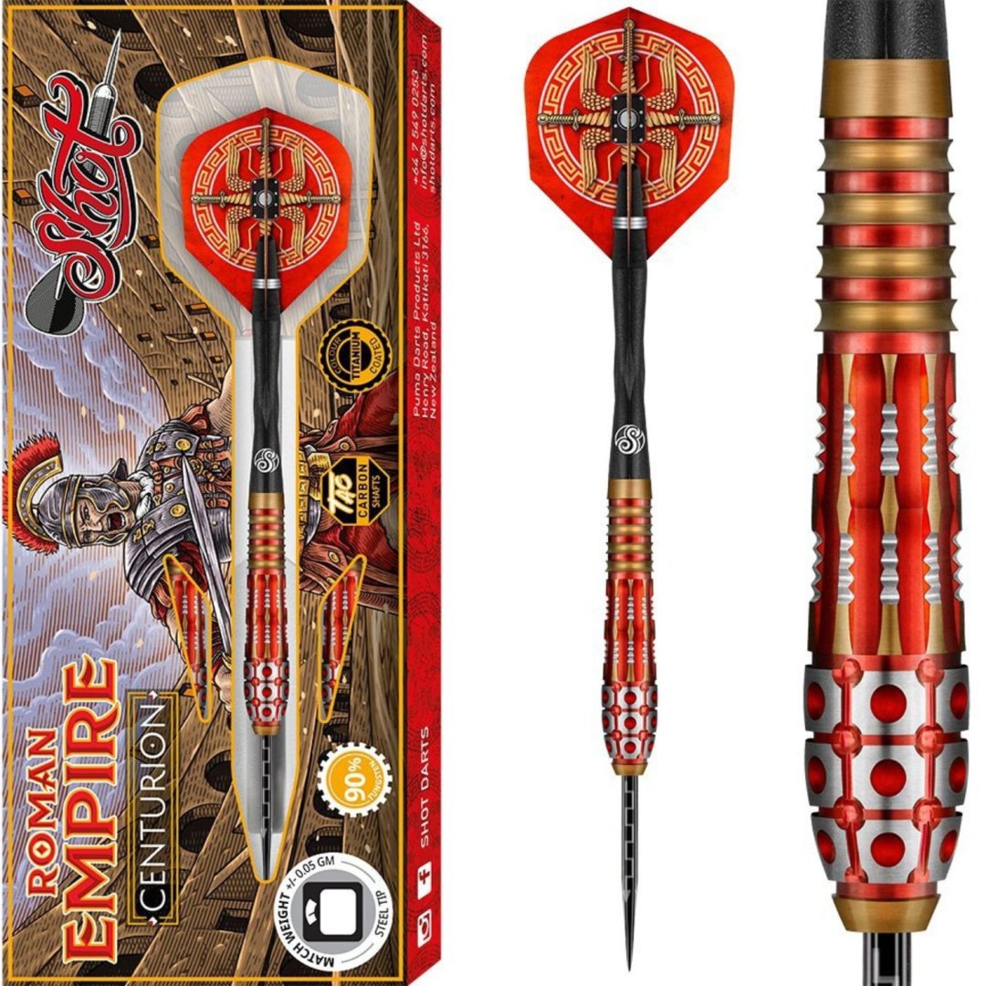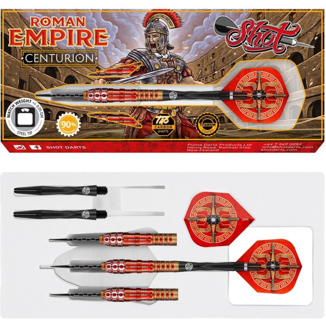 Steelové šipky Shot Roman Empire Centurion jsou wolframové šipky (90% tungsten) s ohnivými barrely. Bronzovo-stříbrné barrely mají drážky zvýrazněné červenou barvou. Barrely jsou doplněny nylonovými násadkami a letkami Shot.