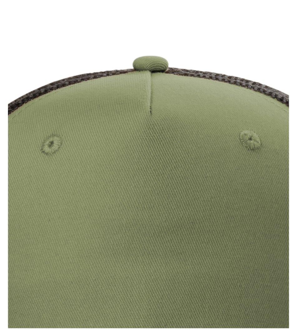 pětipanelový střih, vyztužený přední panel, prodyšná siťovina v zadní části, prošívaný, lehce prohnutý kšilt, obšité větrací otvory, potící páska, velikost nastavitelná plastovými patentky