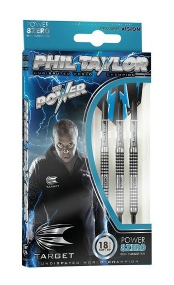 Unikátní softové šipky Phil Taylor Power 8Zero jsou wolframové šipky podpořeny šampionem Philem Taylorem. Šipky mají rovné barrely, které jsou vroubkované a zdobí je černé proužky. Barrely jsou doplněny násadkami Pro Grip a letkami Power Phil Taylor.