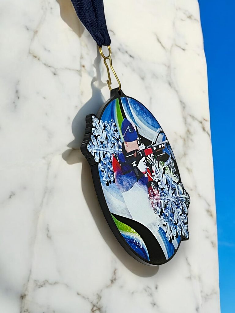 Akrylátová medaile. Tloušťka 0,3 cm. Cena medaile za 1 kus včetně stuhy. Speciální černý lesklý akryl. Speciální vrstvený tisk.