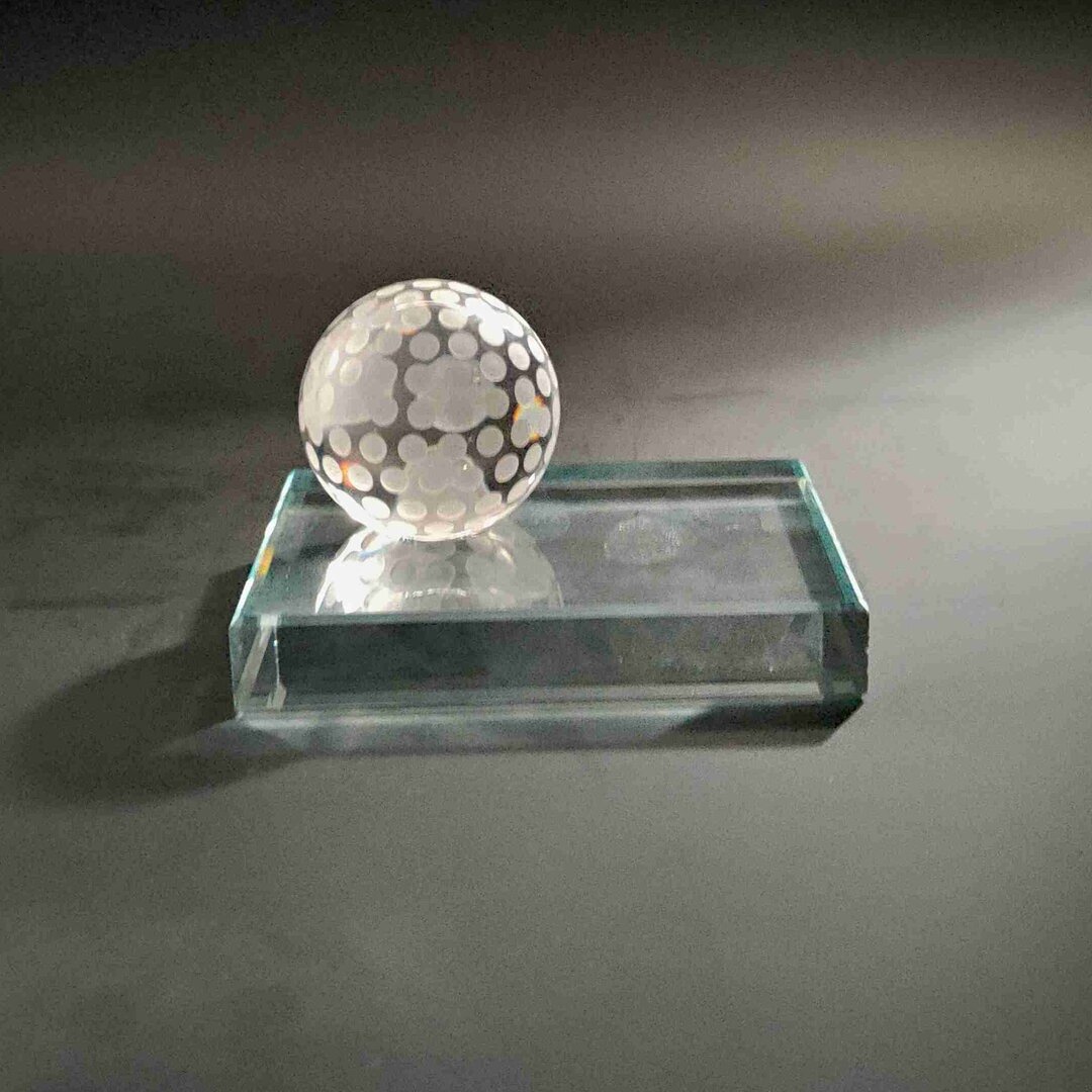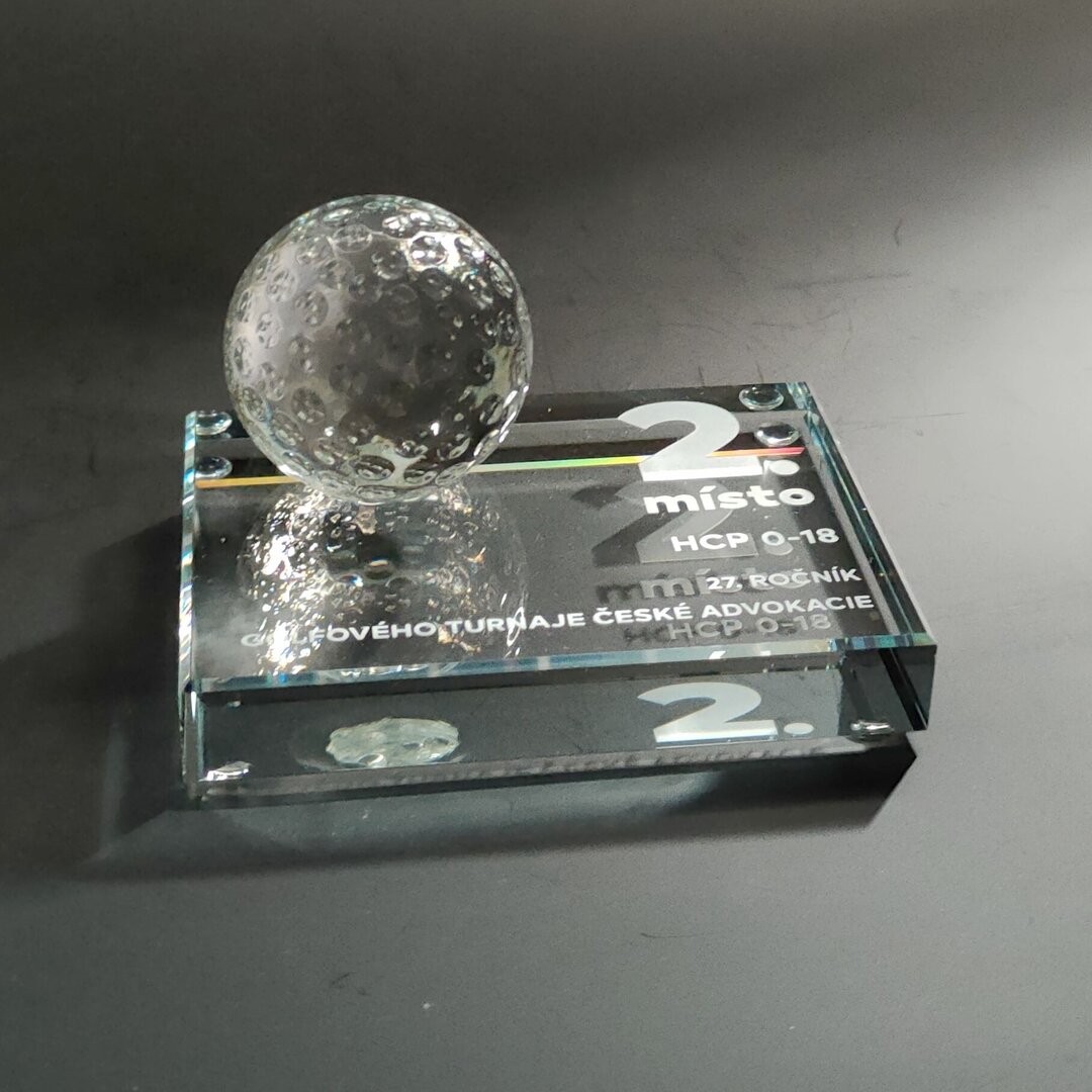 - Trofej z 19 mm silného skla s golfovým míčkem s prostorem pro umístění dekoru.
