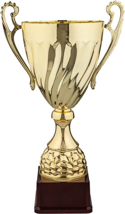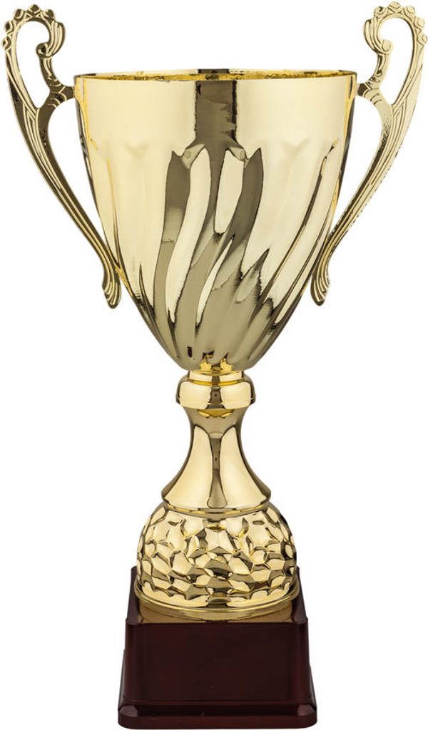 Sportovní pohár s dřevěným podstavcem.