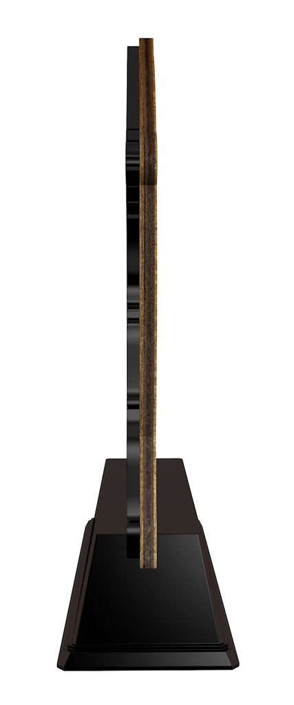 Dřevěná trofej s černým plastovým podstavcem, UV potiskem a siluetou z černého lesklého akrylátu. V ceně trofeje není zahrnuta cena štítku. Štítek vyberete v následujícím kroku, po vámi zvolené velikosti trofeje a barvy.