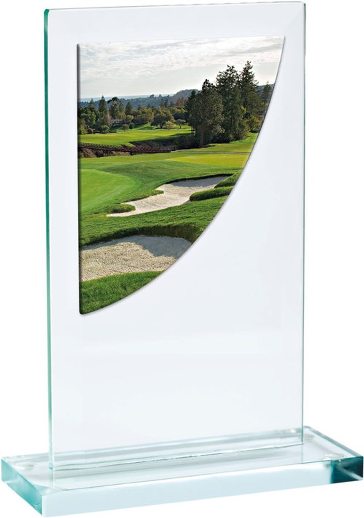 Skleněná trofej s akrylátovým motivem. Na trofej lze umístit logo či text. Laserové gravírování.