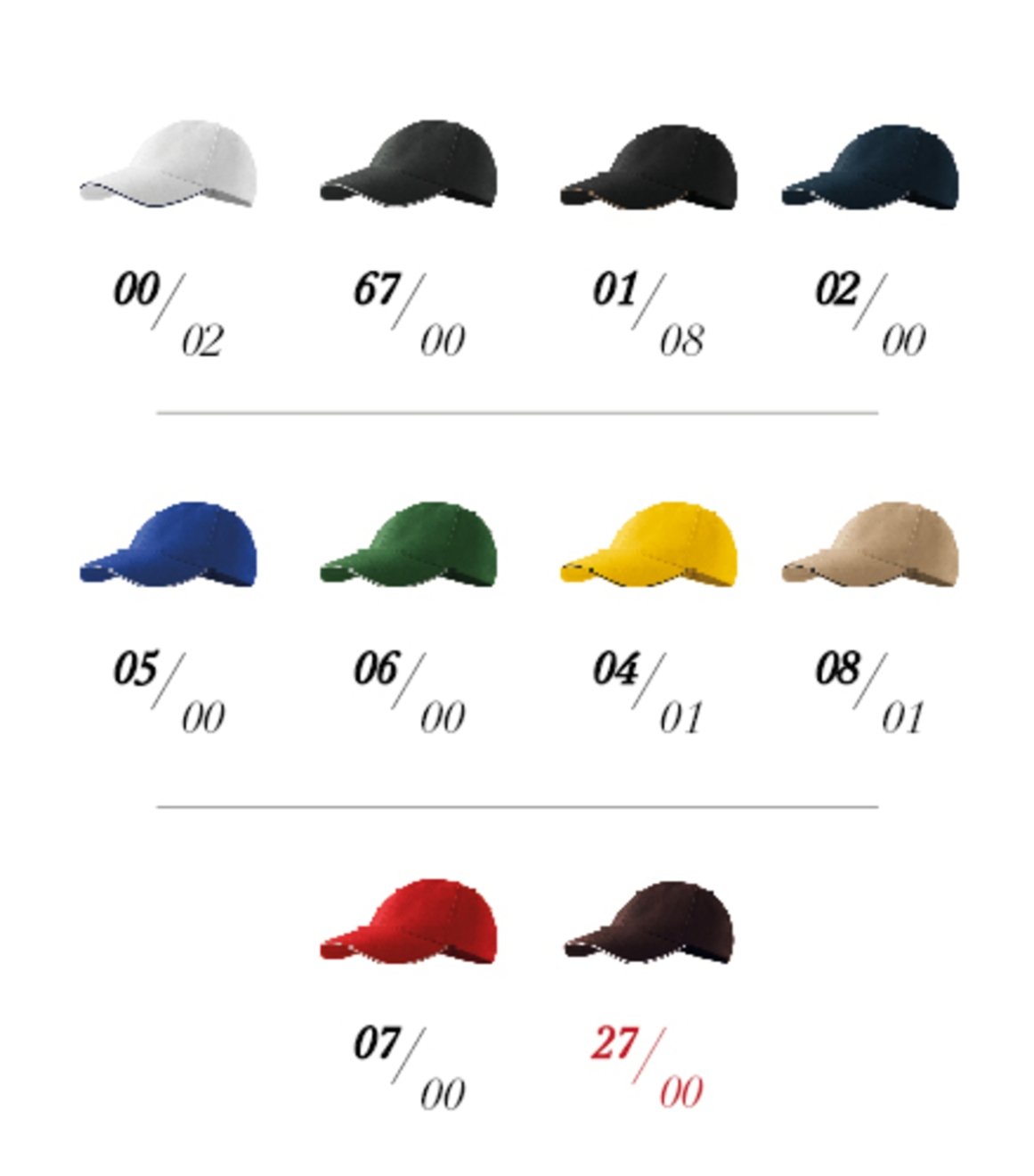 šestipanelový střih, vyztužené 2 přední panely, prošívaný, lehce prohnutý kšilt s konstrastním proužkem, obšité větrací otvory, potící páska, velikost nastavitelná mosazným klipem