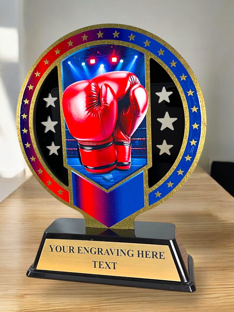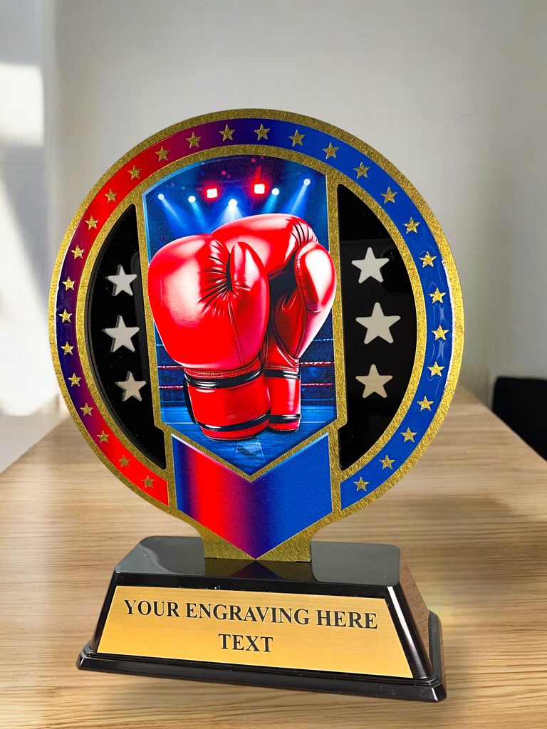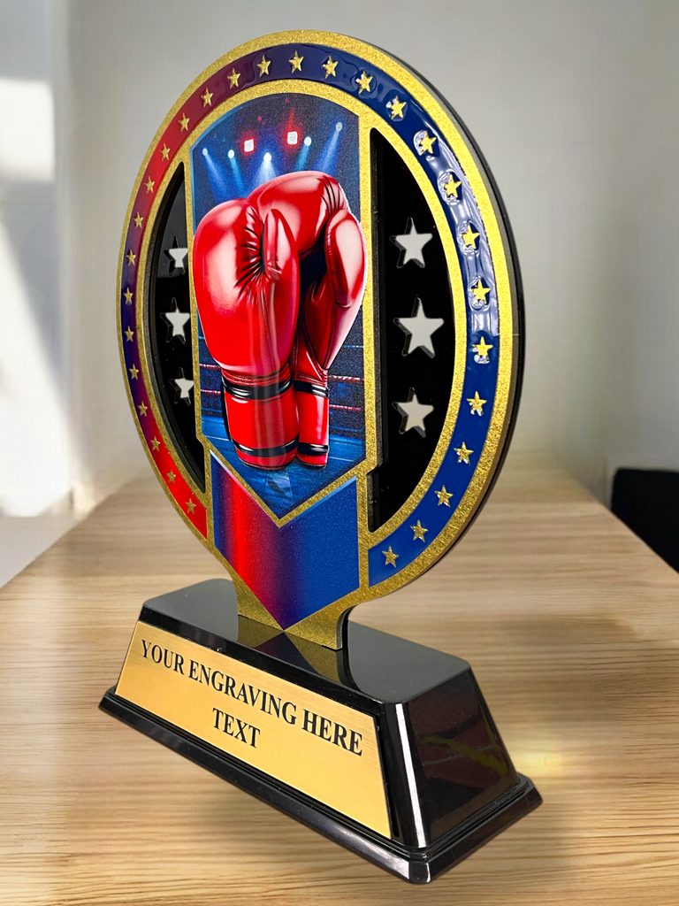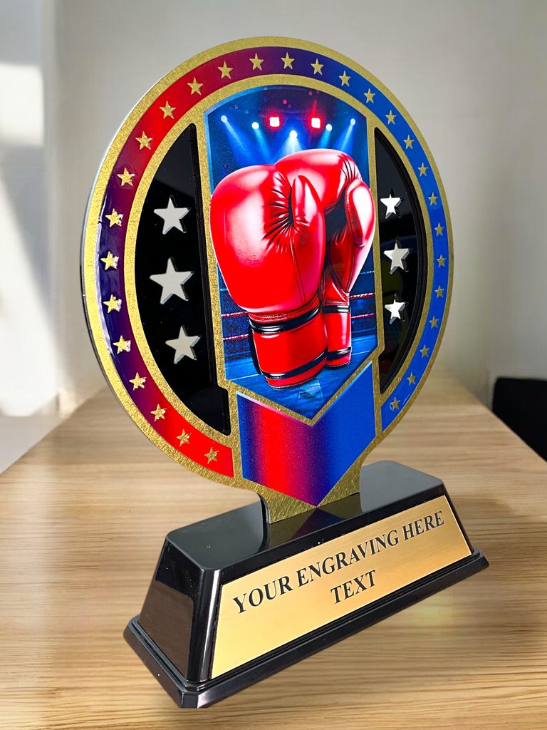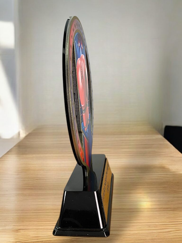 Elegantní kovová trofej kombinovaná s černým akrylátem. V ceně trofeje není zahrnuta cena štítku. Tloušťka trofeje je 0,4 cm. Podstavec je černý.