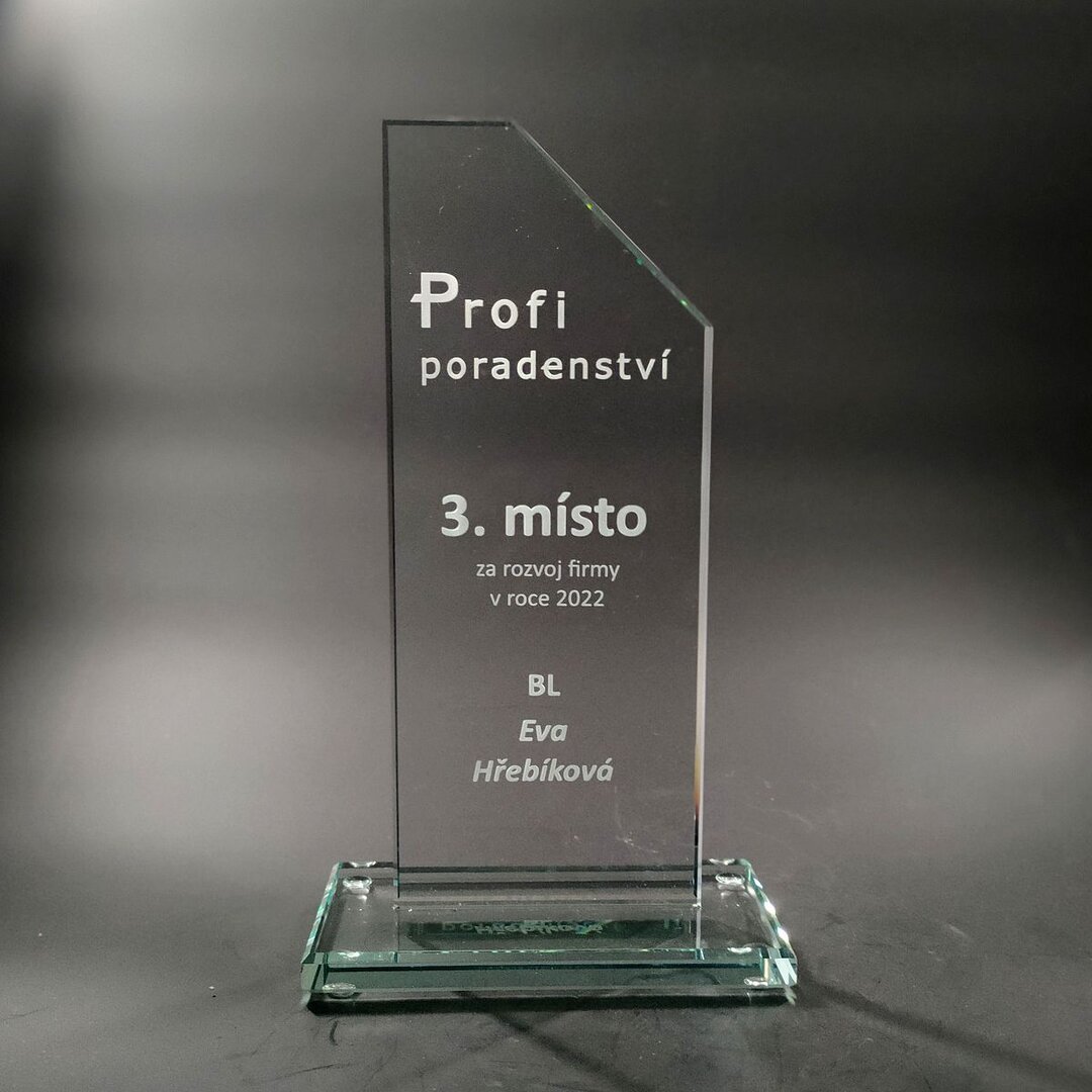 Elegantní skleněná trofej z čirého 12mm bílého skla na pevném 19mm soklu.
