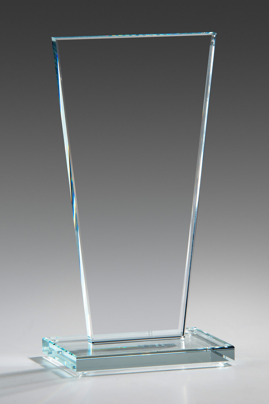 Trofej z 12 mm silného bílého skla ve čtyřech velikostech s velkým prostorem pro umístění dekoru.