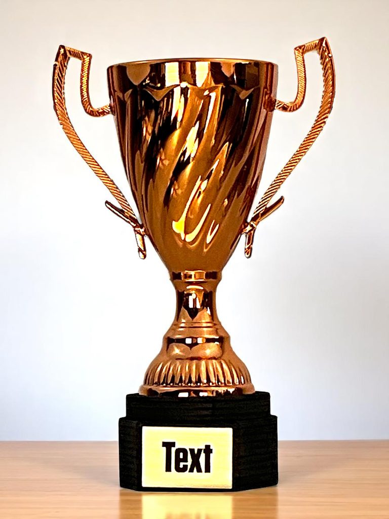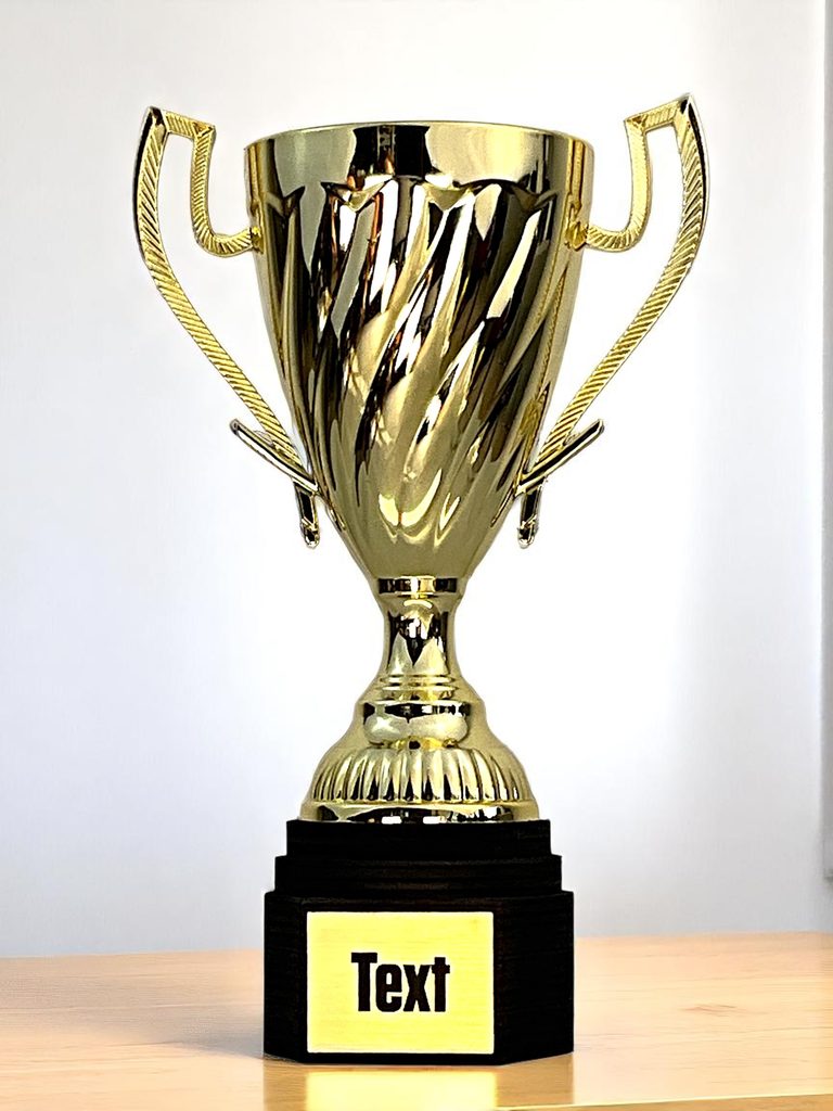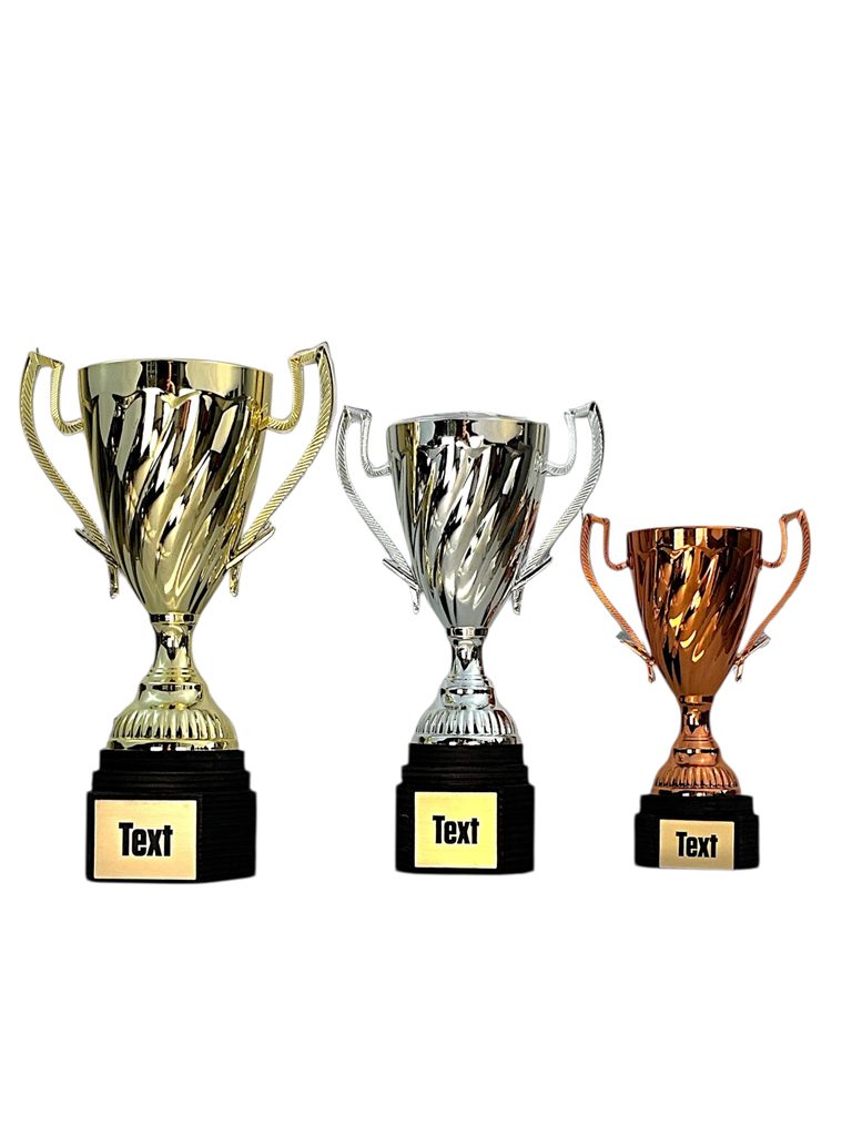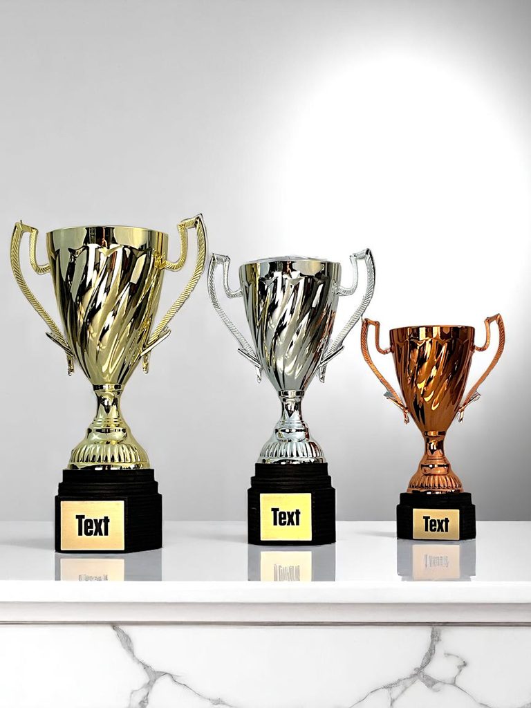 Zlatý pohár 21cm, stříbrný pohár 19,5cm, bronzový pohár 15cm.