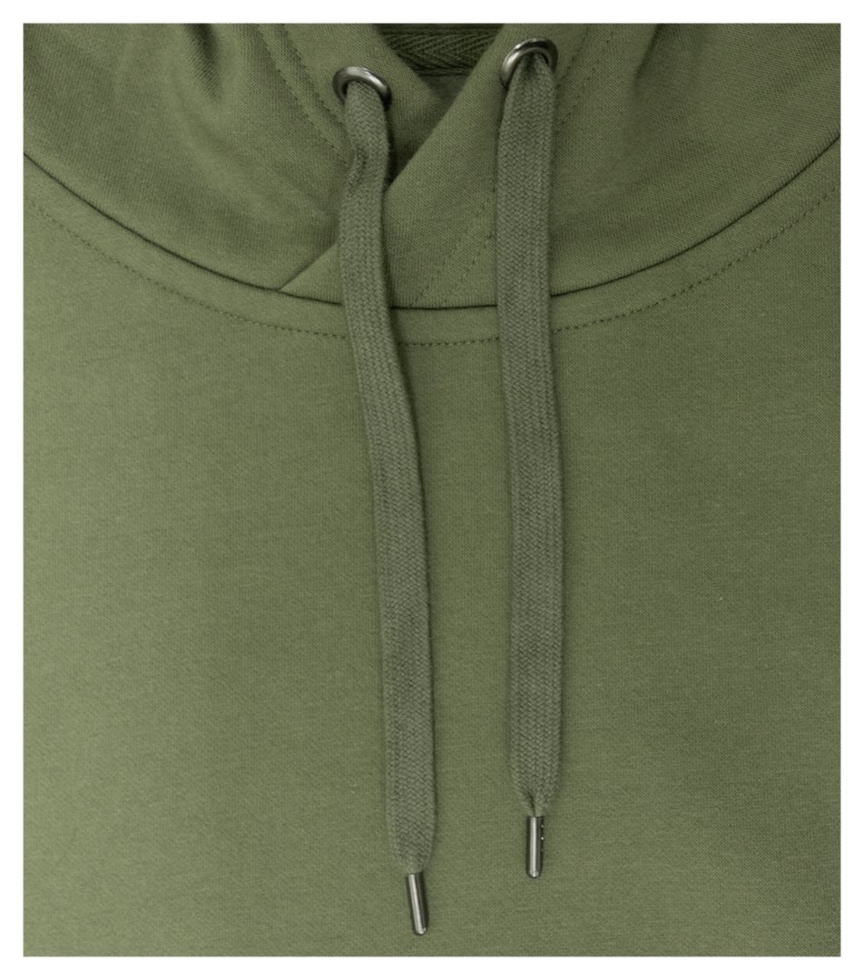 bez etikety - připraveno na rebranding, volný střih s bočními švy, kapuce s podšívkou, na stažení šňůrkou, neutrální velikostní štítek v boční části průkrčníku, vnitřní část průkrčníku začištěna páskou v barvě vrchového materiálu, nízkohlavicové rukávy, lištové kapsy ve stylu klokanky, dolní lem a manžety rukávů z žebrového úpletu 2:2 s 5 % elastanu, vnitřní strana počesaná