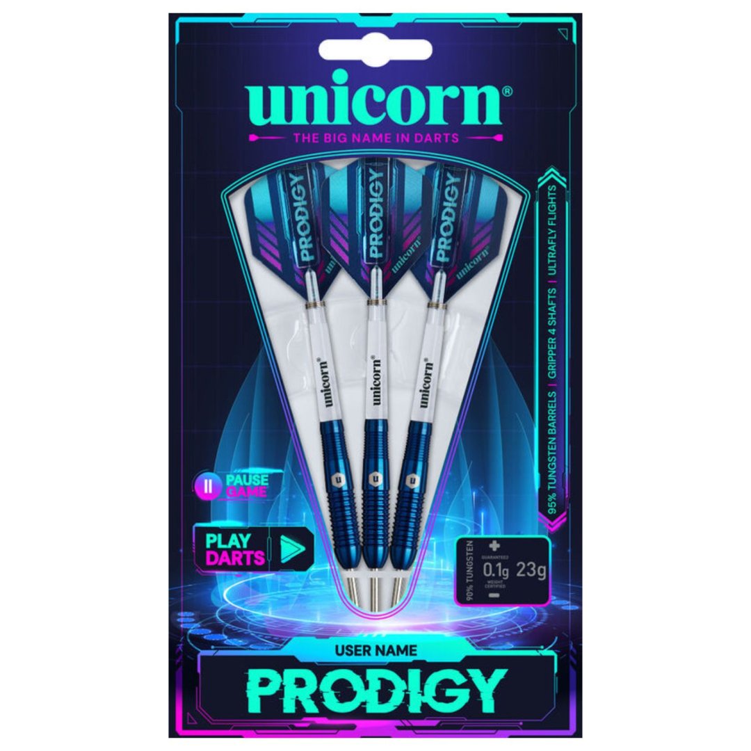 Steelové šipky Unicorn Prodigy jsou wolframové šipky (95% tungsten) s modrými barrely. Barrely doplňují nylonové násadky a letky Prodigy.