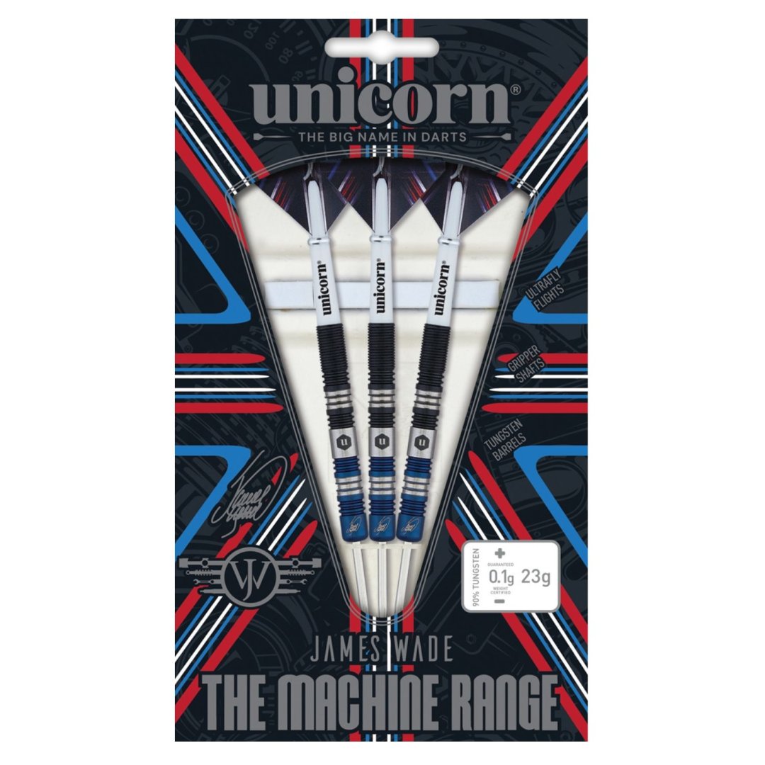 Steelové šipky Unicorn The Machine James Wade jsou wolframové šipky (90% tungsten) s barrely, které mají v přední části modrou barvu a v zadní části černou. Barrely jsou doplněny nylonovými násadkami a letkami Unicorn.