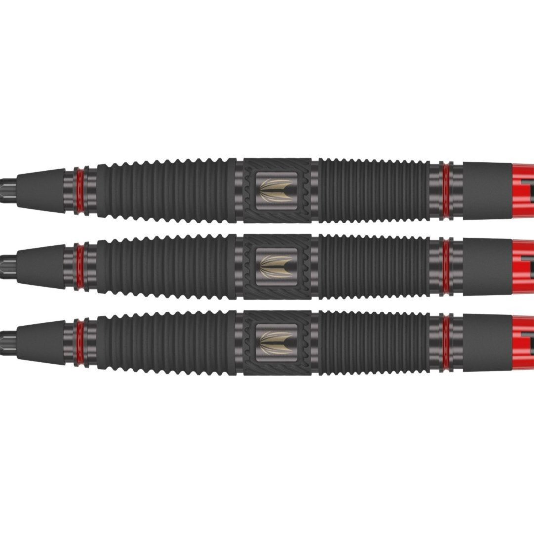 Steelové šipky Target Scope jsou jedinečné wolframové šipky (90 % tungsten) v úchvatném designu. Drážkované barrely jsou pokryté černým PVD povlakem a mají matný vzhled. Zdobí je dva červené proužky. Barrely jsou doplněny nylonovými násadkami, letkami Scope a hroty Swiss Point. Součástí balení je i nástroj na výměnu hrotů Swiss Point.