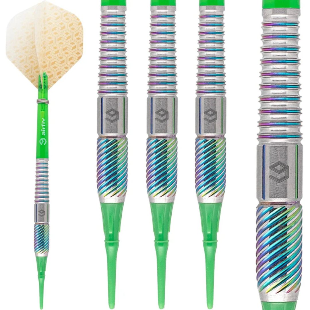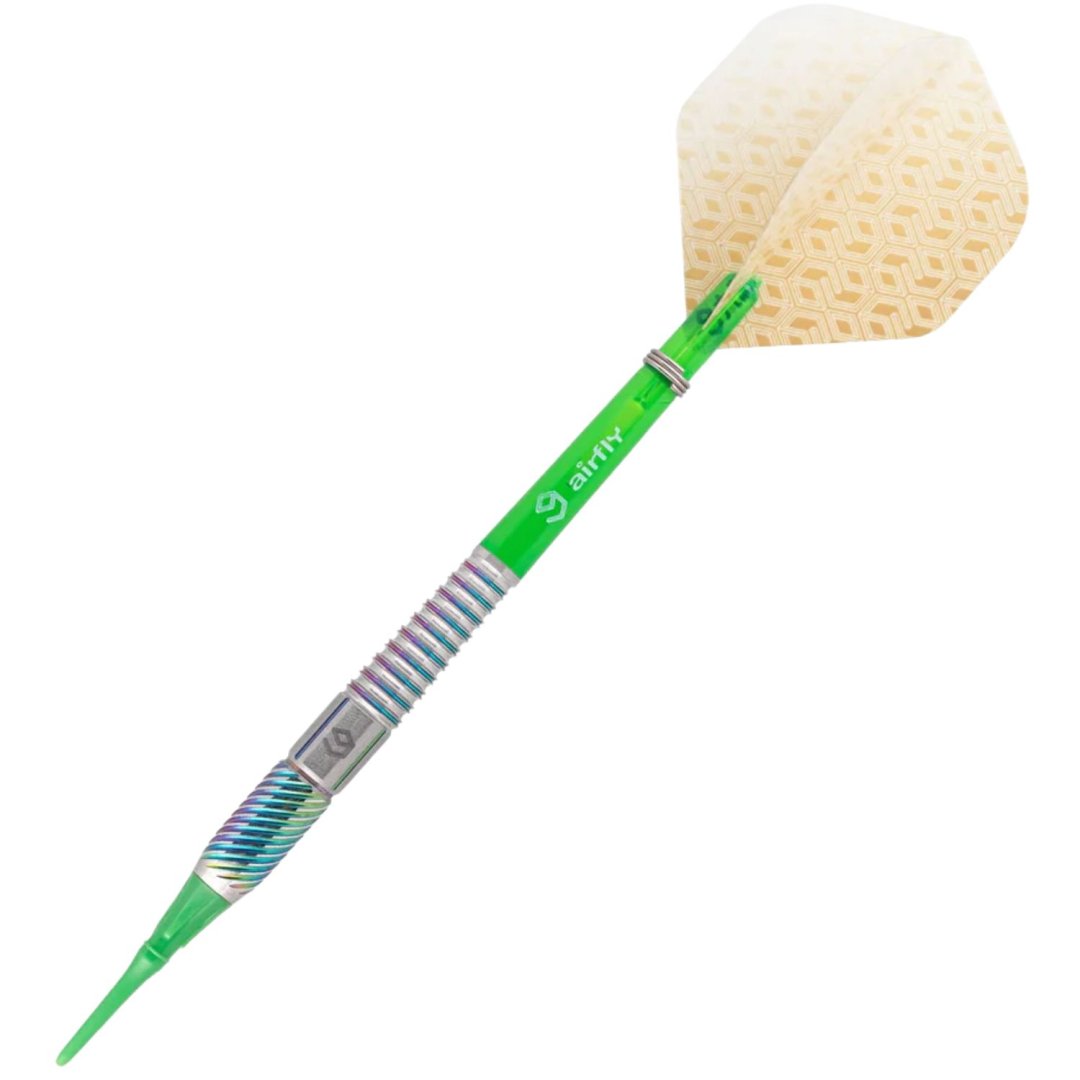 Softové šipky Caliburn Player jsou wolframové šipky (90% tungsten) s barrely, které mají drážky zvýrazněné duhovými barvami.