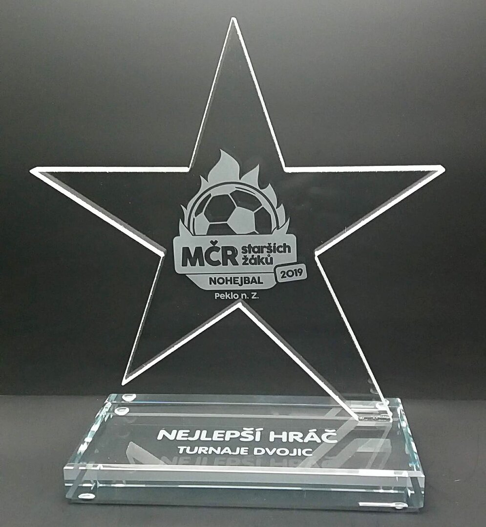 Elegantní skleněná trofej z čirého 12mm bílého skla na pevném 19mm soklu. Moderní a dynamický design ve tvaru hvězdy z ní dělá výjimečný symbol úspěchu a ocenění. Díky čistým liniím a kvalitnímu zpracování působí slavnostně a zároveň univerzálně – vhodná pro sportovní soutěže, firemní ocenění i společenské akce.