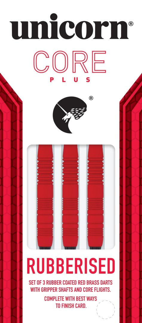Softové šipky Unicorn Core Plus Rubberised Red jsou brassové šipky s pogumovaným červeným povrchem. Barrely jsou drážkované a jsou doplněny násadkami Gripper a letkami Unicorn.