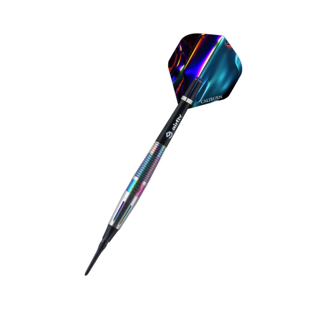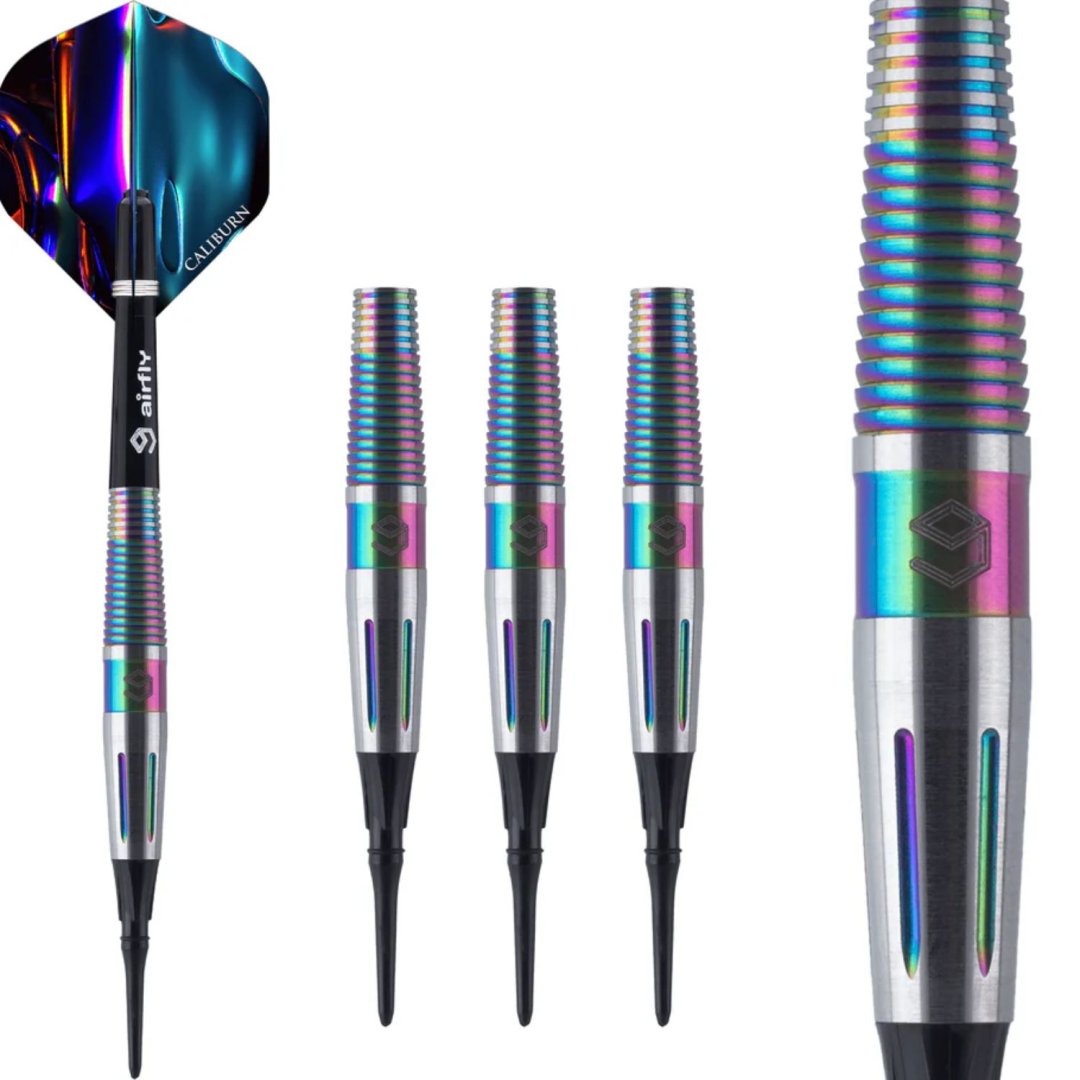 Softové šipky Caliburn Element jsou wolframové šipky (90% tungsten) v úchvatném designu. Barrely mají drážkování zvýrazněné duhovými barvami.