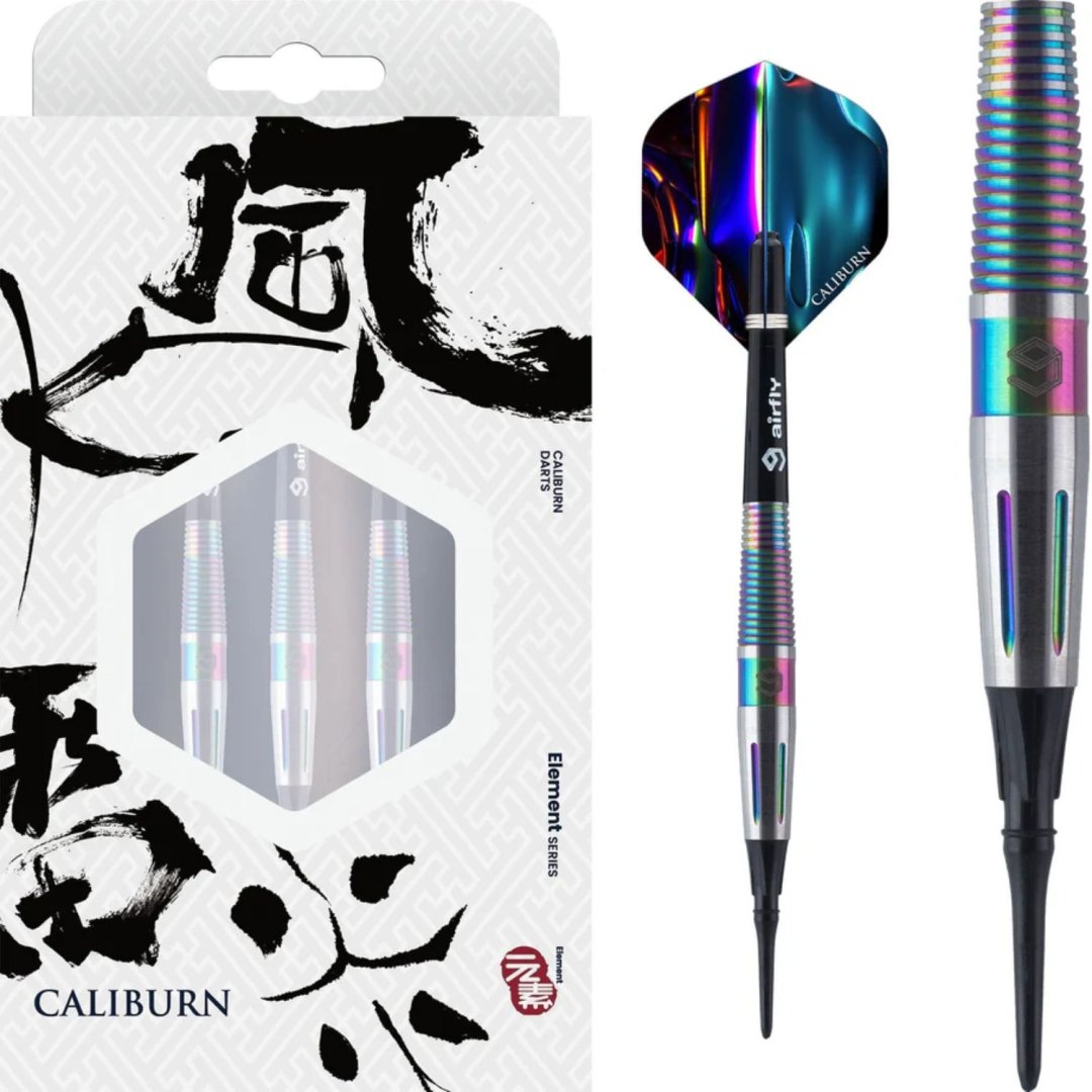 Softové šipky Caliburn Element jsou wolframové šipky (90% tungsten) v úchvatném designu. Barrely mají drážkování zvýrazněné duhovými barvami. Barrely jsou doplněny nylonovými násadkami a letkami Caliburn.