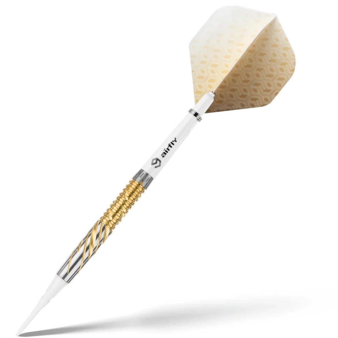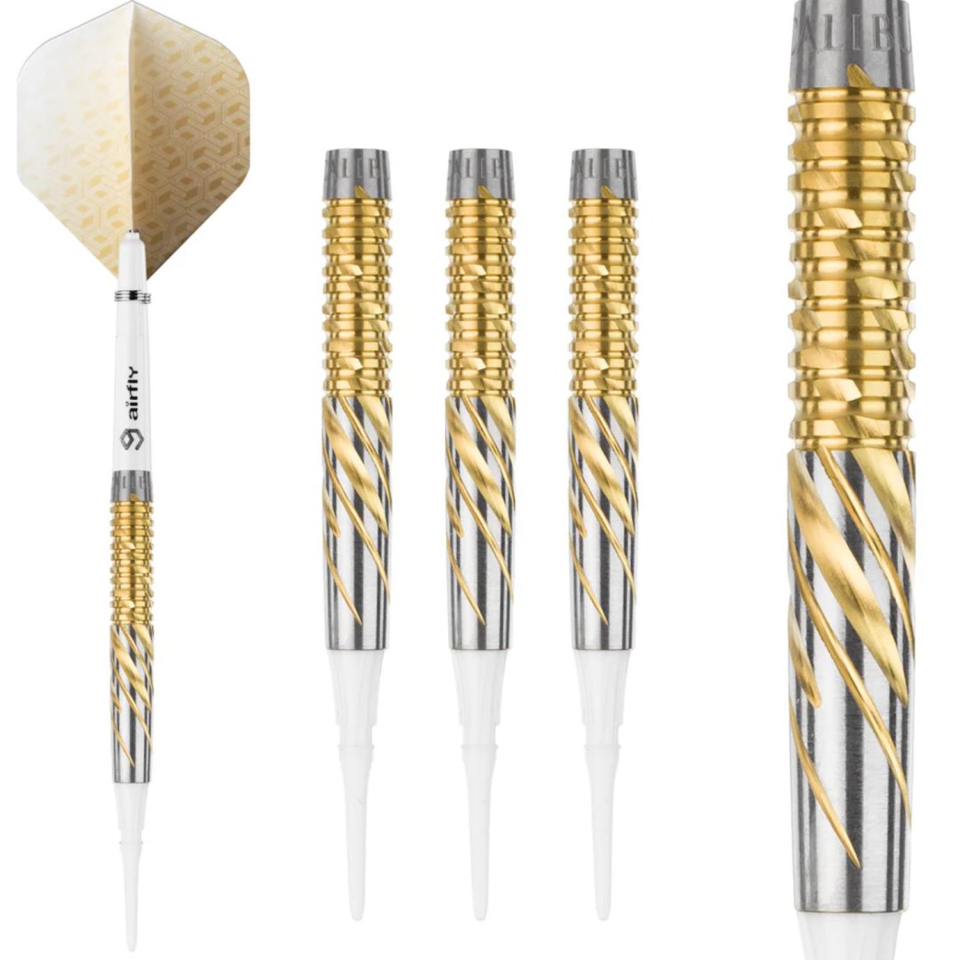Softové šipky Caliburn Nexus jsou wolframové šipky (95% tungsten) v úchvatném designu. Barrely mají drážkování zvýrazněné zlatou barvou.