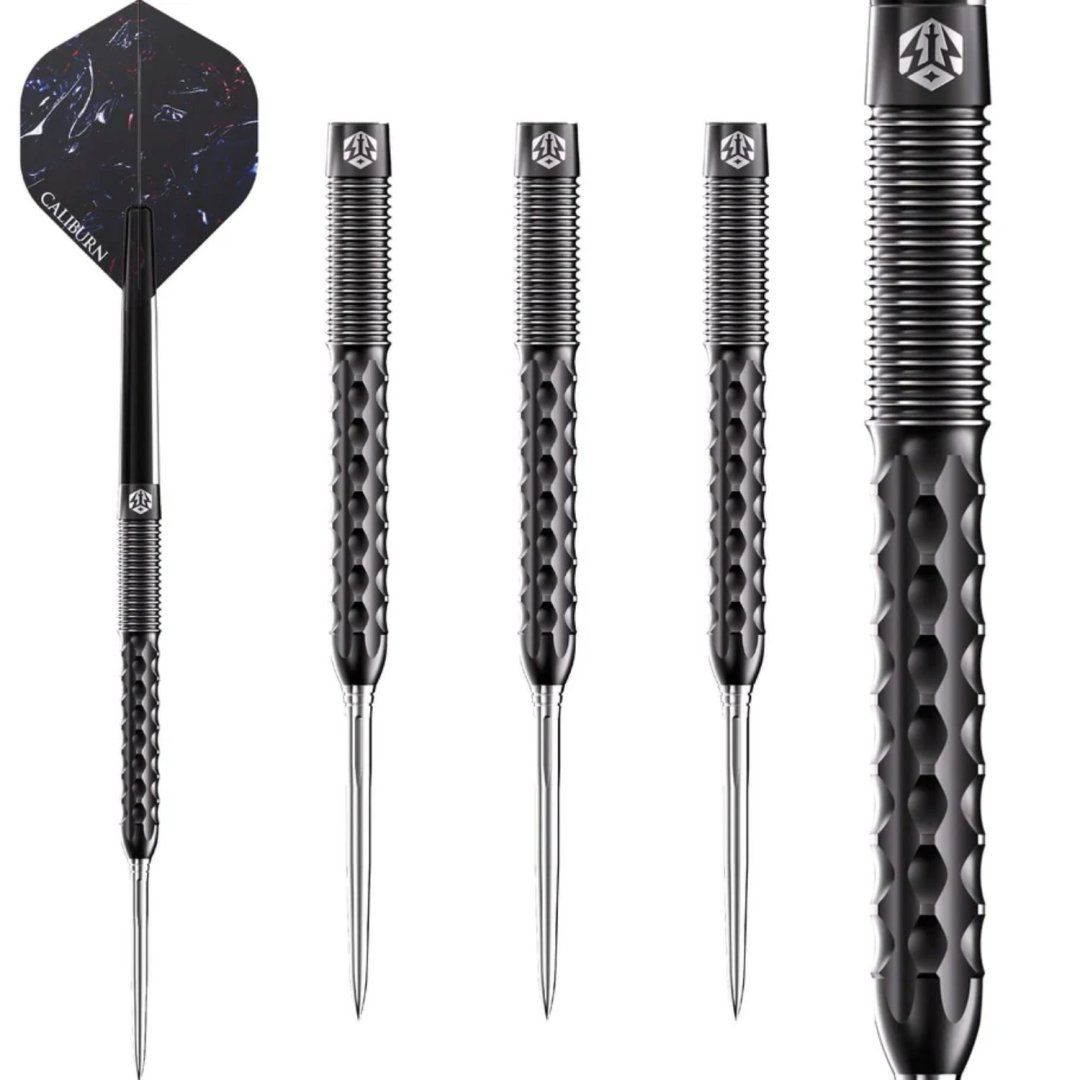 Steelové šipky Caliburn Sword jsou wolframové šipky (95% tungsten) s černými barrely v úchvatném designu. Barrely jsou doplněny nylonovými násadkami a letkami Caliburn. Šipky mají vyměnitelný systém hrotů Caliburn Replaceable Point System. Dodávány jsou i s klíčem pro výměnu hrotů Caliburn (X1997).