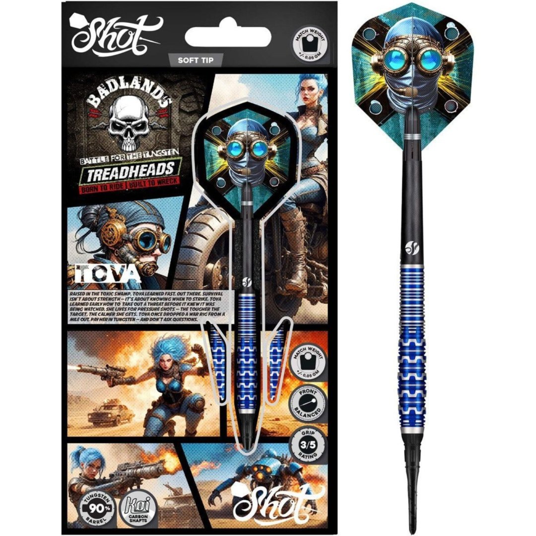 Softové šipky Shot Badlands Tova jsou wolframové šipky (90% tungsten) s barrely v jedinečném designu. Drážkování je zvýrazněno modrou barvou. Barrely jsou doplněny nylonovými násadkami a letkami Shot.