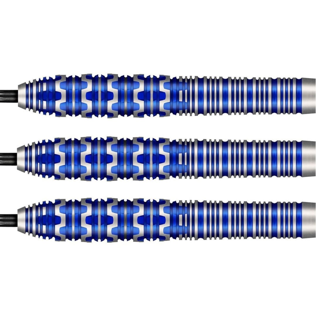 Steelové šipky Shot Badlands jsou wolframové šipky (90% tungsten) s barrely v jedinečném designu. Drážkování je zvýrazněno modrou barvou.