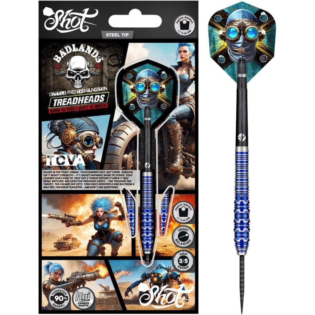 Steelové šipky Shot Badlands jsou wolframové šipky (90% tungsten) s barrely v jedinečném designu. Drážkování je zvýrazněno modrou barvou. Barrely jsou doplněny nylonovými násadkami a letkami Shot.