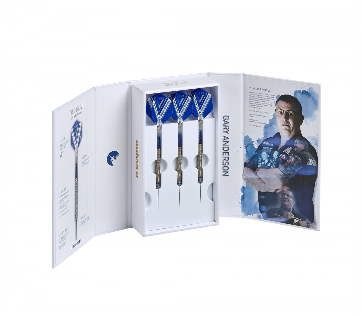 Steelové wolframové šipky (90% tungsten) s barrely, které jsou vroubkované po celé délce a na začátku se vyjímají dva modré proužky. Barrely jsou doplněny nylonovými násadkami a letkami Gary Anderson. Balení navíc obsahuje 2 sady násadek a 3 sady letek.
