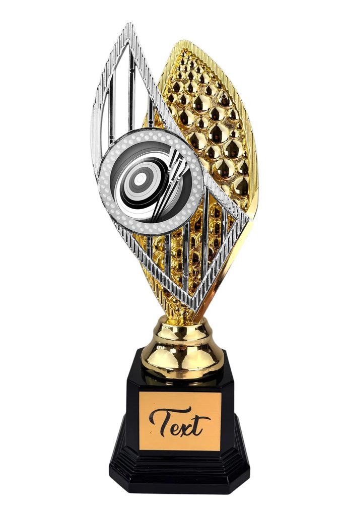Stylová trofej v barvách zlato, stříbro nebo bronz, výška 31 cm. Designový emblém se sportovním motivem v nejvyšší kvalitě tisku s lakem. Možnost doplnění štítku dle vaší volby.
