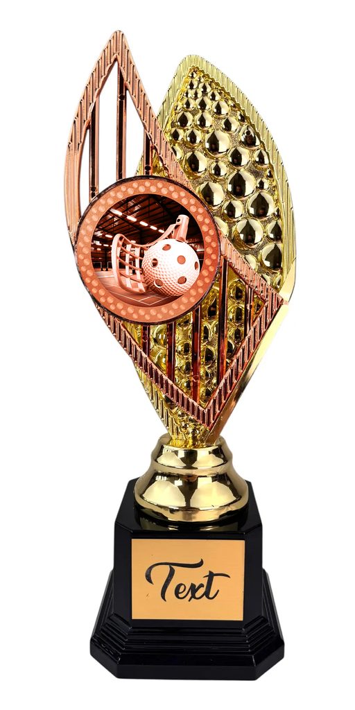 Stylová trofej v barvách zlato, stříbro nebo bronz, výška 31 cm. Designový emblém se sportovním motivem v nejvyšší kvalitě tisku s lakem. Možnost doplnění štítku dle vaší volby.