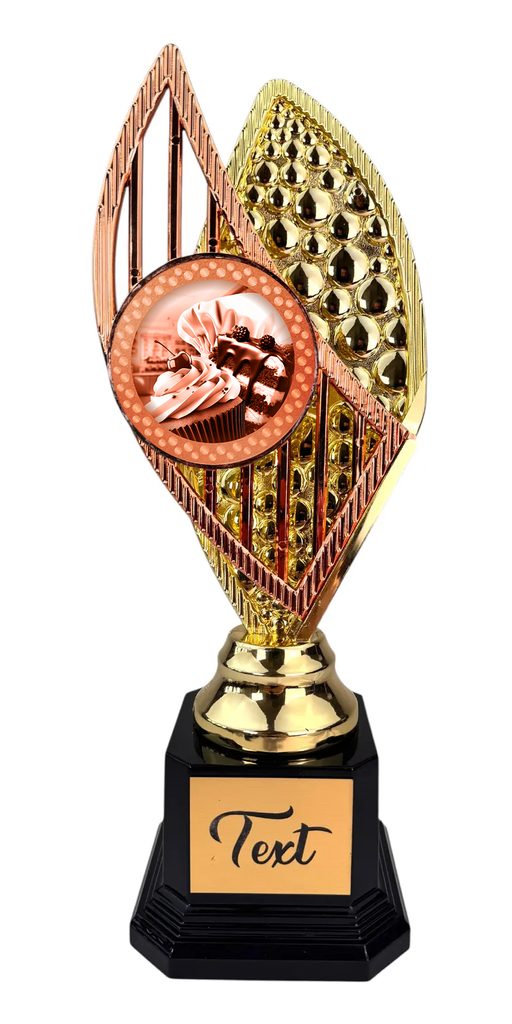 Stylová trofej v barvách zlato, stříbro nebo bronz, výška 31 cm. Designový emblém se sportovním motivem v nejvyšší kvalitě tisku s lakem. Možnost doplnění štítku dle vaší volby.