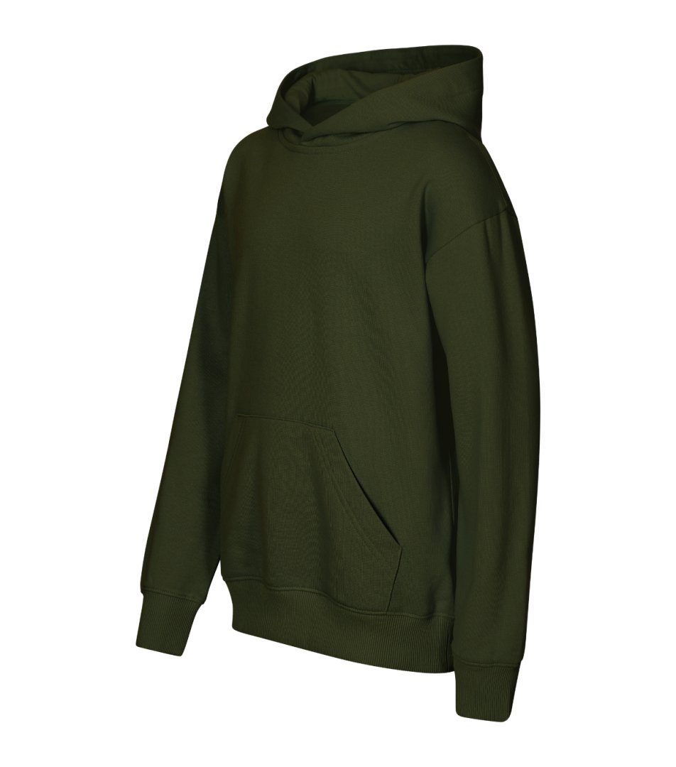 bez etikety - připraveno na rebranding, volný střih s bočními švy, kapuce s podšívkou, neutrální velikostní štítek v boční části průkrčníku, vnitřní část průkrčníku začištěna páskou, nízkohlavicové rukávy, nakládaná kapsa ve stylu klokanky, dolní lem a manžety rukávů z žebrového úpletu 2:2 s 5 % elastanu, vnitřní strana počesaná