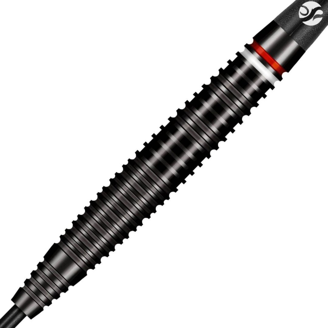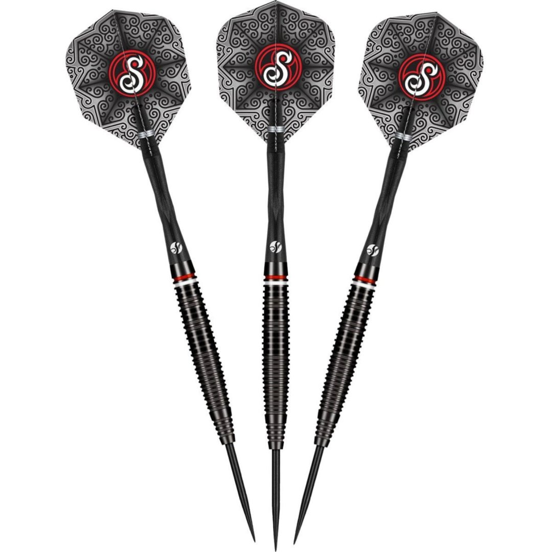 Steelové šipky Shot Pro Series Carl Sneyd jsou wolframové šipky (90% tungsten) s černými barrely s červeným a bílým proužkem.
