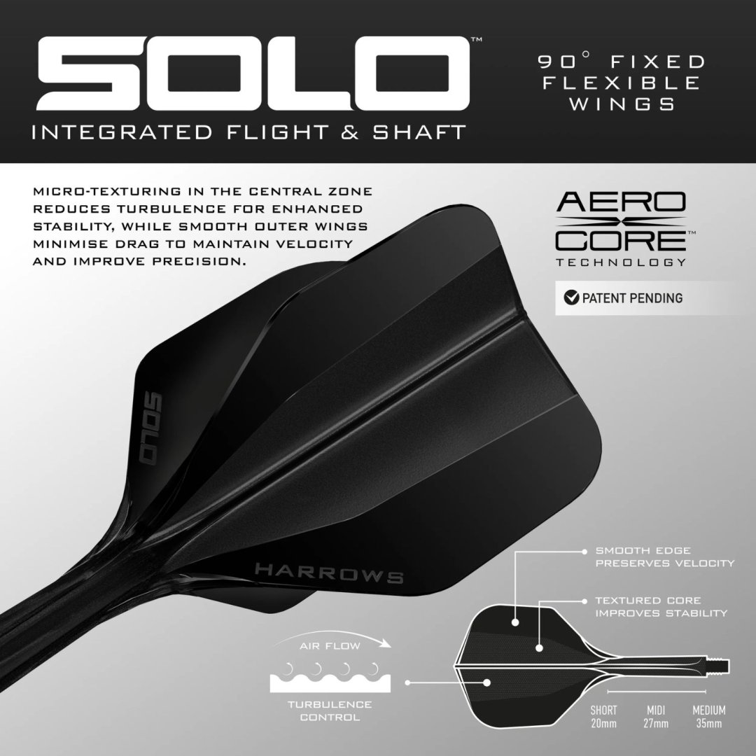 Harrows Solo je systém integrovaných plastových letek s násadkou, který je vyroben z vysoce kvalitních a odolných materiálů a při hře udržuje dokonalý úhel 90 stupňů.